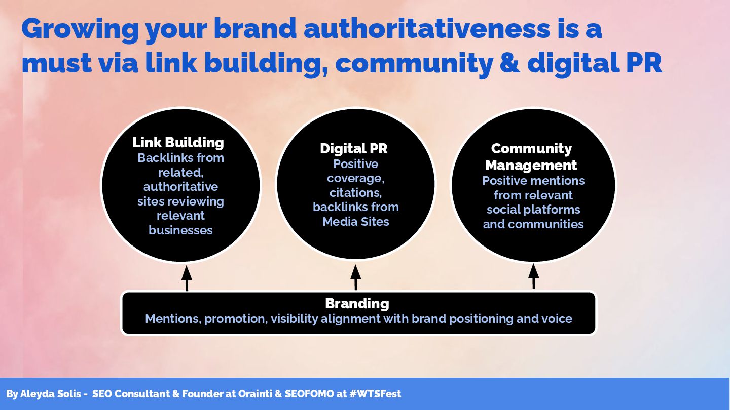 & SEOFOMO at #WTSFest Growing your brand authoritativeness is a must via link building, community & digital PR Digital PR Positive coverage, citations, backlinks from Media Sites Community Management Positive mentions from relevant social platforms and communities Link Building Backlinks from related, authoritative sites reviewing relevant businesses Branding Mentions, promotion, visibility alignment with brand positioning and voice