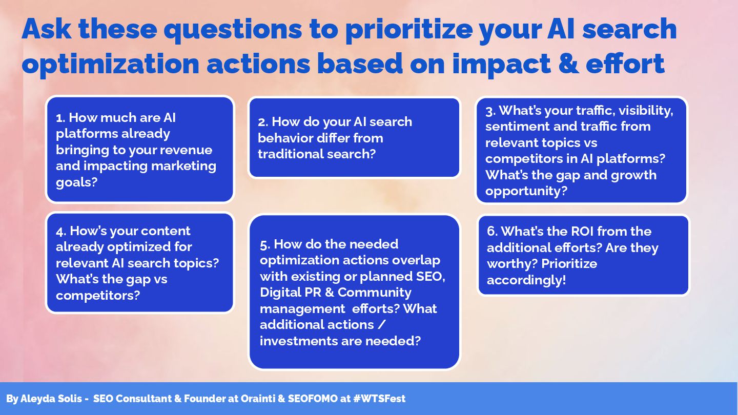& SEOFOMO at #WTSFest 1. How much are AI platforms already bringing to your revenue and impacting marketing goals? 2. How do your AI search behavior differ from traditional search? 3. What’s your traffic, visibility, sentiment and traffic from relevant topics vs competitors in AI platforms? What’s the gap and growth opportunity? 4. How’s your content already optimized for relevant AI search topics? What’s the gap vs competitors? 5. How do the needed optimization actions overlap with existing or planned SEO, Digital PR & Community management efforts? What additional actions / investments are needed? 6. What’s the ROI from the additional efforts? Are they worthy? Prioritize accordingly! Ask these questions to prioritize your AI search optimization actions based on impact & effort