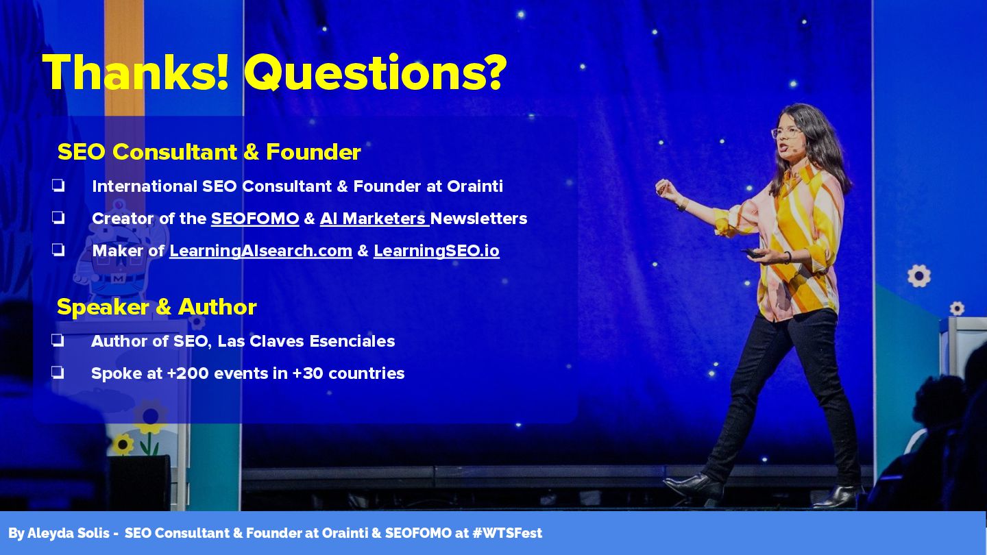 & Founder at Orainti ❏ Creator of the SEOFOMO & AI Marketers Newsletters ❏ Maker of LearningAIsearch.com & LearningSEO.io Speaker & Author ❏ Author of SEO, Las Claves Esenciales ❏ Spoke at +200 events in +30 countries By Aleyda Solis - SEO Consultant & Founder at Orainti & SEOFOMO at #WTSFest