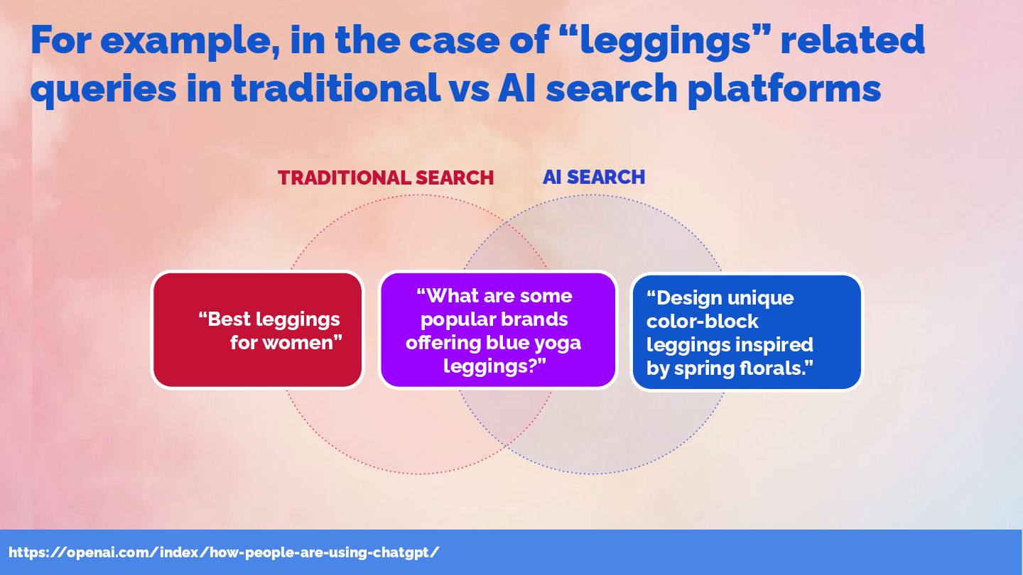 queries in traditional vs AI search platforms TRADITIONAL SEARCH AI SEARCH “Best leggings for women” “What are some popular brands offering blue yoga leggings?” “Design unique color-block leggings inspired by spring florals.”