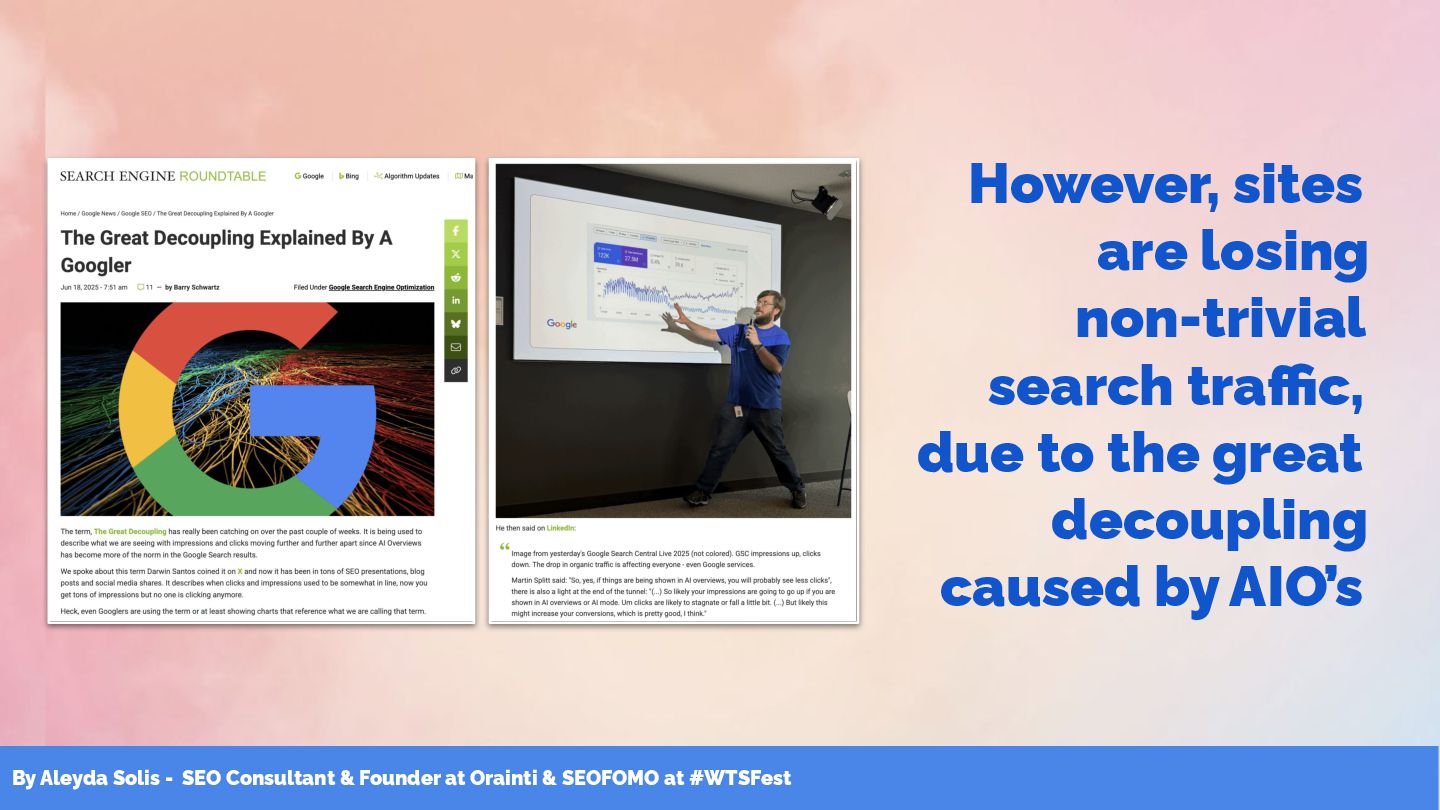 & SEOFOMO at #WTSFest However, sites are losing non-trivial search traffic, due to the great decoupling caused by AIO’s