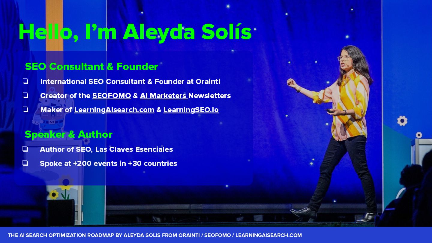ALEYDA SOLIS FROM ORAINTI / SEOFOMO / LEARNINGAISEARCH.COM SEO Consultant & Founder ❏ International SEO Consultant & Founder at Orainti ❏ Creator of the SEOFOMO & AI Marketers Newsletters ❏ Maker of LearningAIsearch.com & LearningSEO.io Speaker & Author ❏ Author of SEO, Las Claves Esenciales ❏ Spoke at +200 events in +30 countries