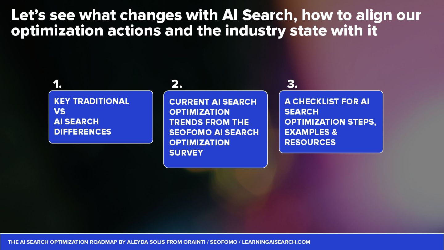 our optimization actions and the industry state with it THE AI SEARCH OPTIMIZATION ROADMAP BY ALEYDA SOLIS FROM ORAINTI / SEOFOMO / LEARNINGAISEARCH.COM KEY TRADITIONAL VS AI SEARCH DIFFERENCES CURRENT AI SEARCH OPTIMIZATION TRENDS FROM THE SEOFOMO AI SEARCH OPTIMIZATION SURVEY A CHECKLIST FOR AI SEARCH OPTIMIZATION STEPS, EXAMPLES & RESOURCES 1. 2. 3.