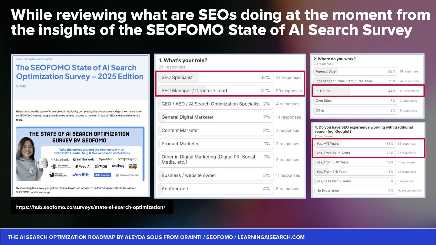 / SEOFOMO / LEARNINGAISEARCH.COM While reviewing what are SEOs doing at the moment from the insights of the SEOFOMO State of AI Search Survey https://hub.seofomo.co/surveys/state-ai-search-optimization/