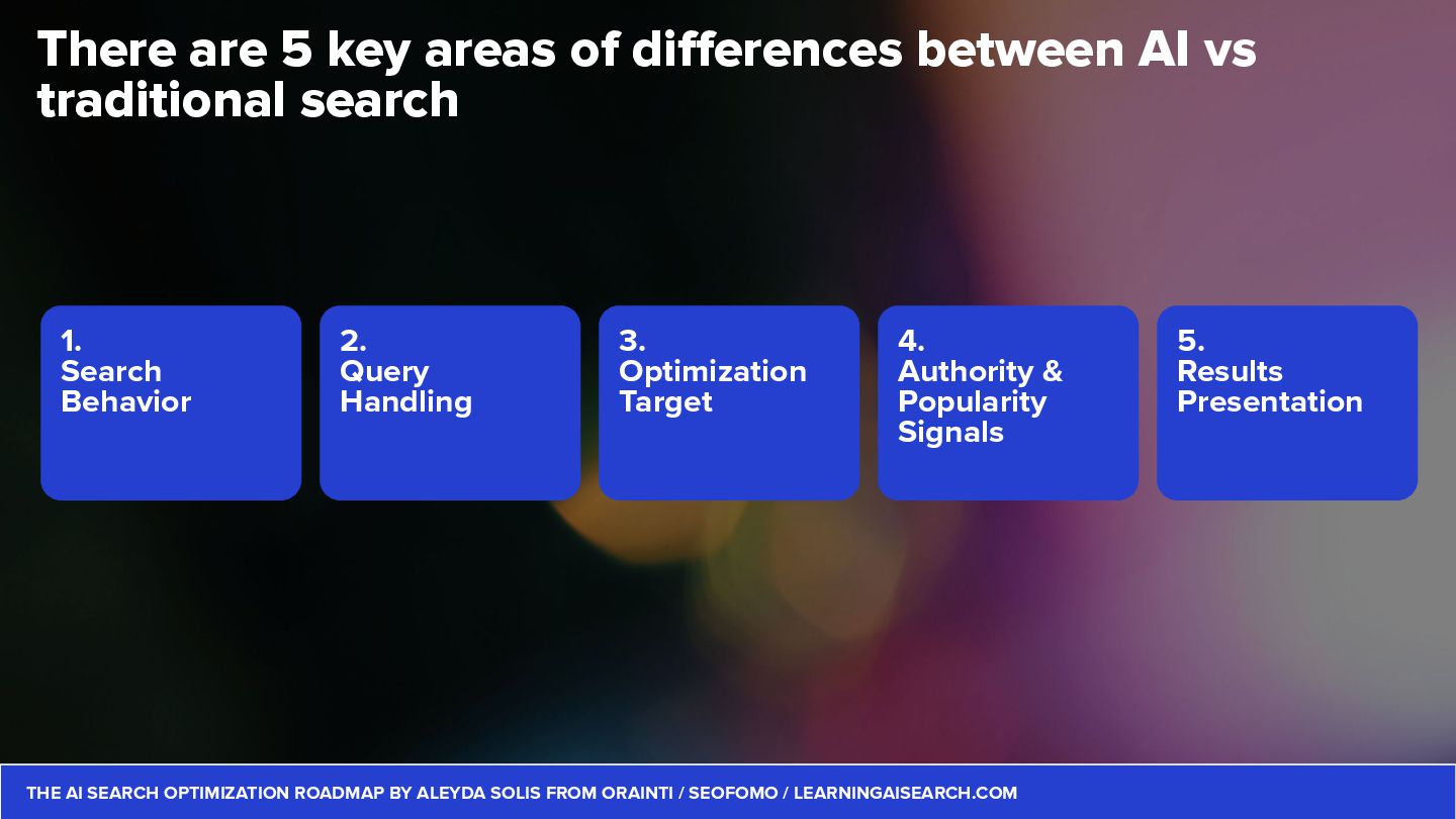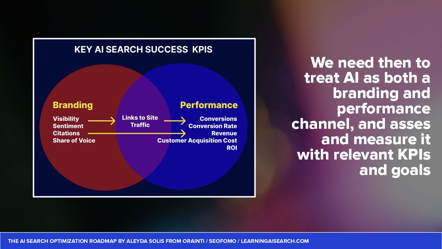 SEOFOMO / LEARNINGAISEARCH.COM THE AI SEARCH OPTIMIZATION ROADMAP BY ALEYDA SOLIS FROM ORAINTI / SEOFOMO / LEARNINGAISEARCH.COM 1. You can’t set the same goals and use the same metrics for AI search as you do with traditional search, as a performance only channel * Rankings * SERP Features Inclusion * Traffic * Conversions/Sales * Revenue * Customer Acquisition Cost * ROI * Visibility * Sentiment * Citations * Share of Voice * Conversions/Sales * Revenue * Customer Acquisition Cost * ROI vs Traditional Search AI Search