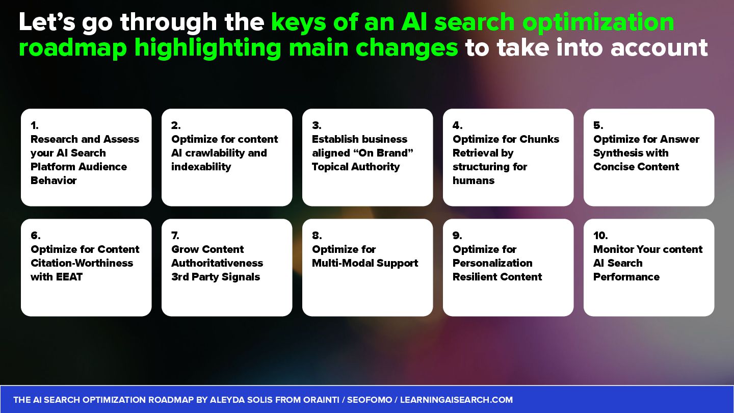 / SEOFOMO / LEARNINGAISEARCH.COM Let’s go through the keys of an AI search optimization roadmap highlighting main changes to take into account 1. Research and Assess your AI Search Platform Audience Behavior 2. Optimize for content AI crawlability and indexability 3. Establish business aligned “On Brand” Topical Authority 4. Optimize for Chunks Retrieval by structuring for humans 5. Optimize for Answer Synthesis with Concise Content 6. Optimize for Content Citation-Worthiness with EEAT 7. Grow Content Authoritativeness 3rd Party Signals 8. Optimize for Multi-Modal Support 9. Optimize for Personalization Resilient Content 10. Monitor Your content AI Search Performance