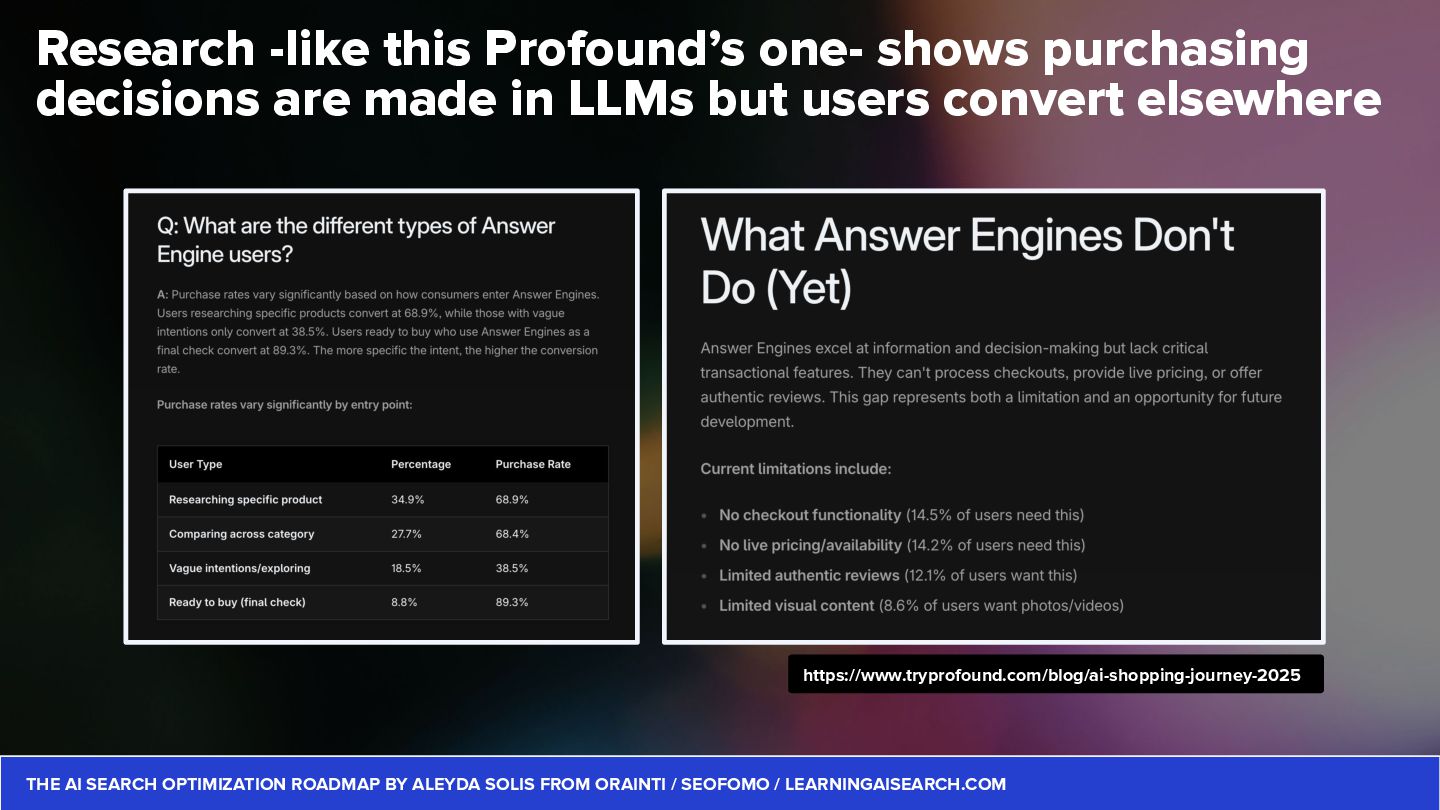 SEOFOMO / LEARNINGAISEARCH.COM THE AI SEARCH OPTIMIZATION ROADMAP BY ALEYDA SOLIS FROM ORAINTI / SEOFOMO / LEARNINGAISEARCH.COM https://www.tryprofound.com/blog/ai-shopping-journey-2025 Research -like this Profound’s one- shows purchasing decisions are made in LLMs but users convert elsewhere