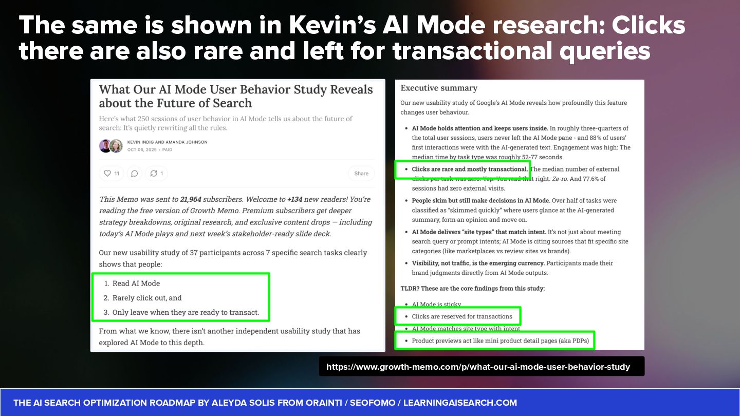 SEOFOMO / LEARNINGAISEARCH.COM THE AI SEARCH OPTIMIZATION ROADMAP BY ALEYDA SOLIS FROM ORAINTI / SEOFOMO / LEARNINGAISEARCH.COM The same is shown in Kevin’s AI Mode research: Clicks there are also rare and left for transactional queries https://www.growth-memo.com/p/what-our-ai-mode-user-behavior-study