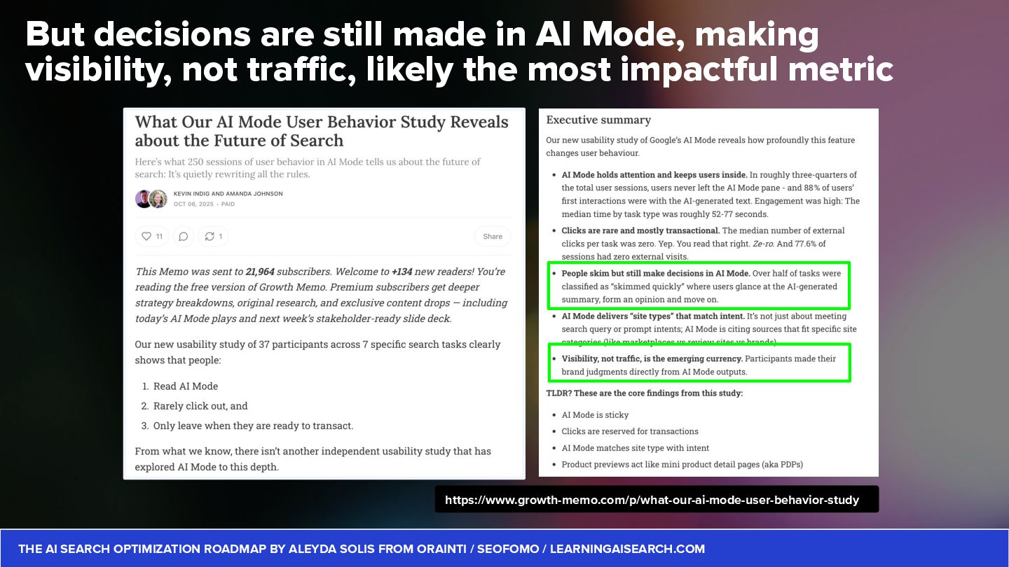 SEOFOMO / LEARNINGAISEARCH.COM THE AI SEARCH OPTIMIZATION ROADMAP BY ALEYDA SOLIS FROM ORAINTI / SEOFOMO / LEARNINGAISEARCH.COM https://www.growth-memo.com/p/what-our-ai-mode-user-behavior-study But decisions are still made in AI Mode, making visibility, not traffic, likely the most impactful metric