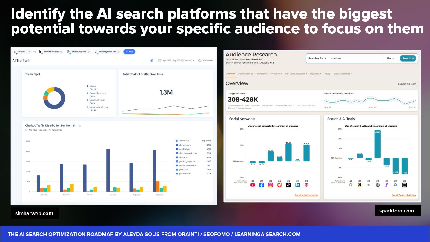 towards your specific audience to focus on them similarweb.com sparktoro.com WINNING ECOMMERCE AI SEARCH BY ALEYDA SOLIS FROM ORAINTI / SEOFOMO / LEARNINGAISEARCH.COM THE AI SEARCH OPTIMIZATION ROADMAP BY ALEYDA SOLIS FROM ORAINTI / SEOFOMO / LEARNINGAISEARCH.COM