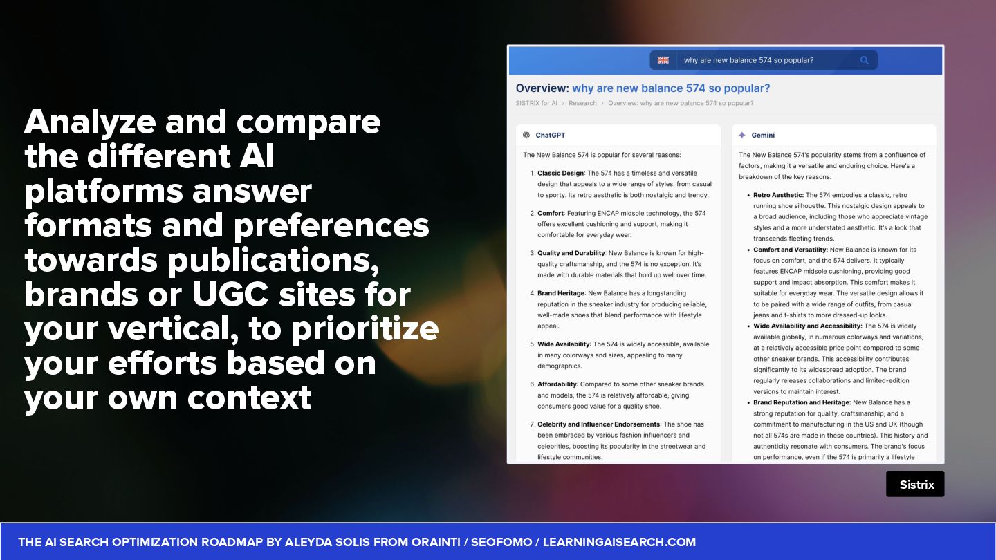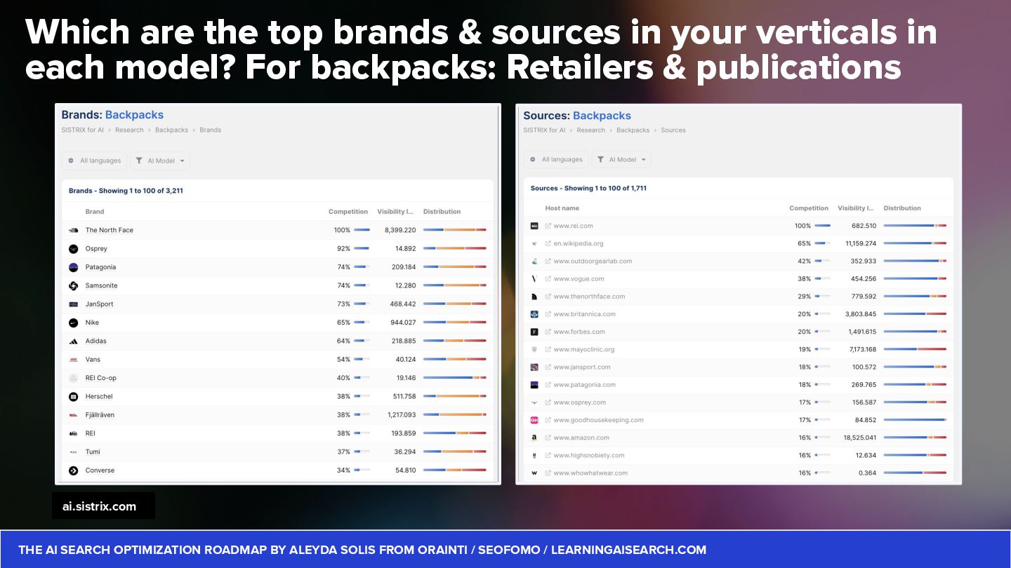 SEOFOMO / LEARNINGAISEARCH.COM THE AI SEARCH OPTIMIZATION ROADMAP BY ALEYDA SOLIS FROM ORAINTI / SEOFOMO / LEARNINGAISEARCH.COM Which are the top brands & sources in your verticals in each model? For backpacks: Retailers & publications ai.sistrix.com
