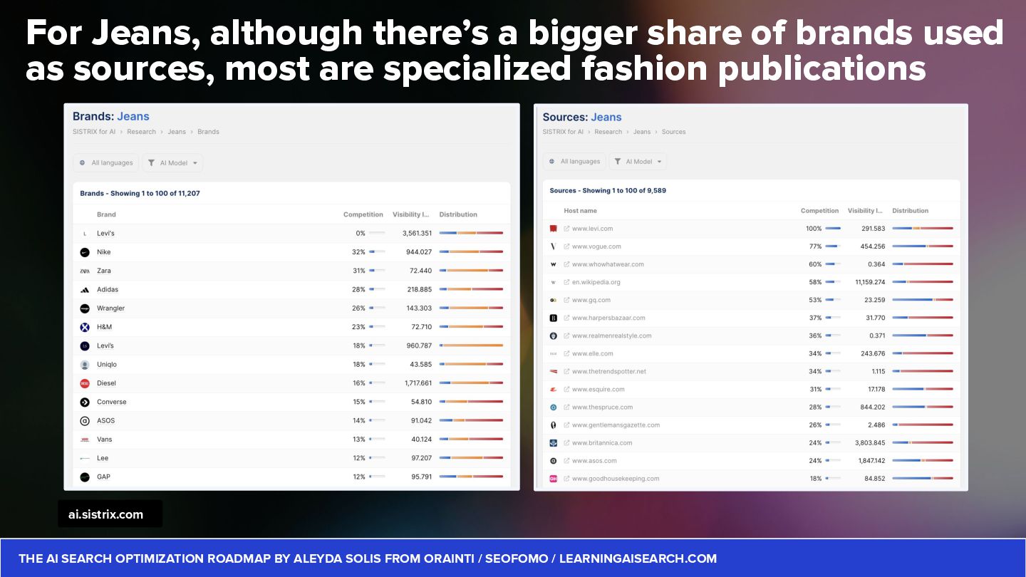 SEOFOMO / LEARNINGAISEARCH.COM THE AI SEARCH OPTIMIZATION ROADMAP BY ALEYDA SOLIS FROM ORAINTI / SEOFOMO / LEARNINGAISEARCH.COM For Jeans, although there’s a bigger share of brands used as sources, most are specialized fashion publications ai.sistrix.com