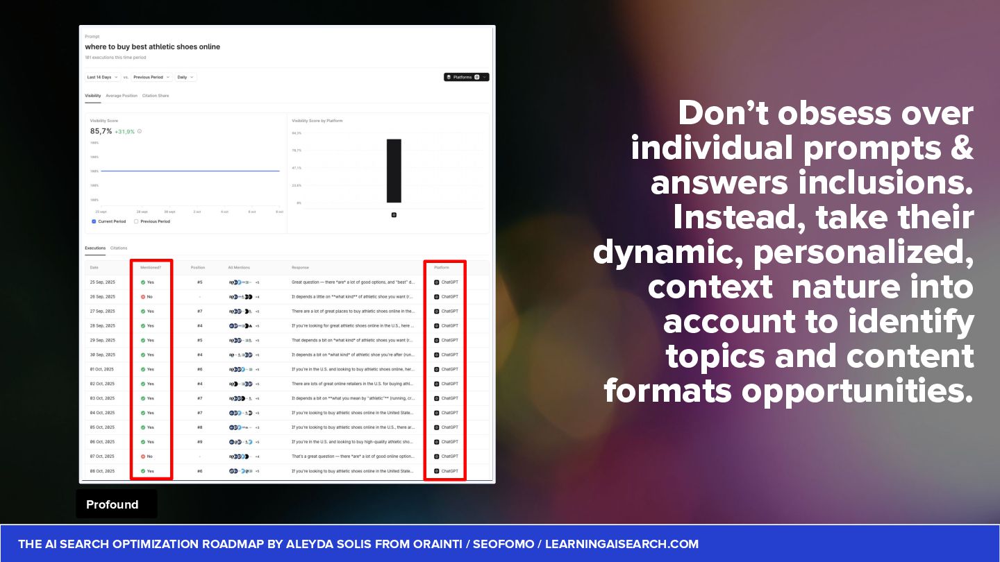 their dynamic, personalized, context nature into account to identify topics and content formats opportunities. Profound THE AI SEARCH OPTIMIZATION ROADMAP BY ALEYDA SOLIS FROM ORAINTI / SEOFOMO / LEARNINGAISEARCH.COM