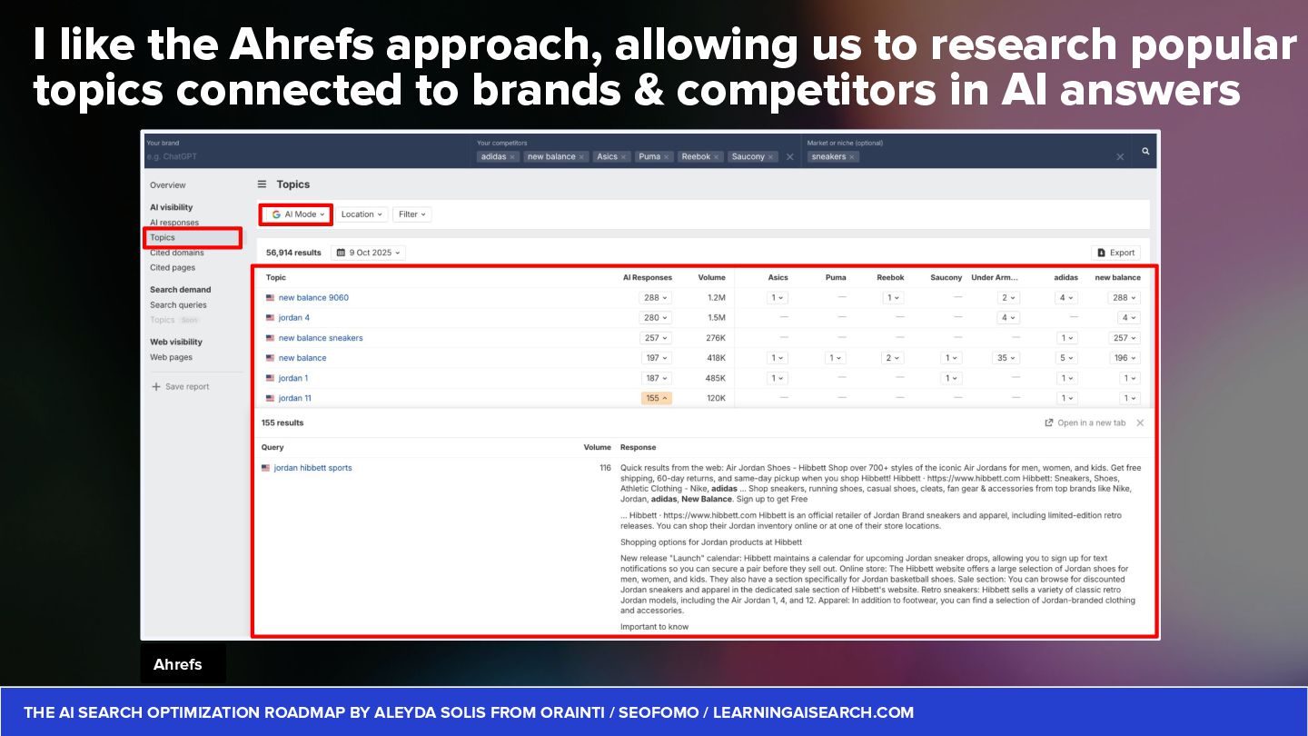 popular topics connected to brands & competitors in AI answers THE AI SEARCH OPTIMIZATION ROADMAP BY ALEYDA SOLIS FROM ORAINTI / SEOFOMO / LEARNINGAISEARCH.COM