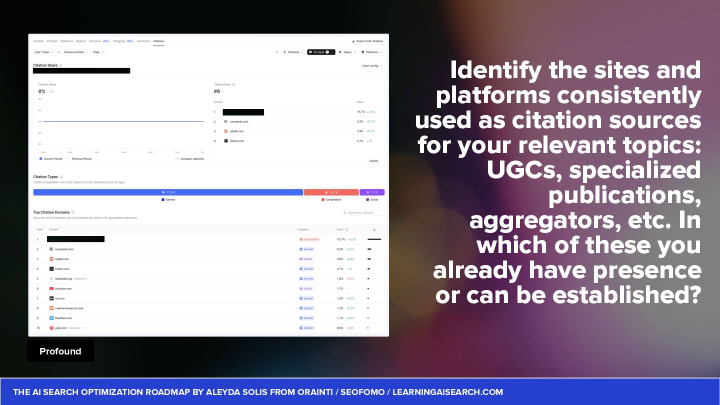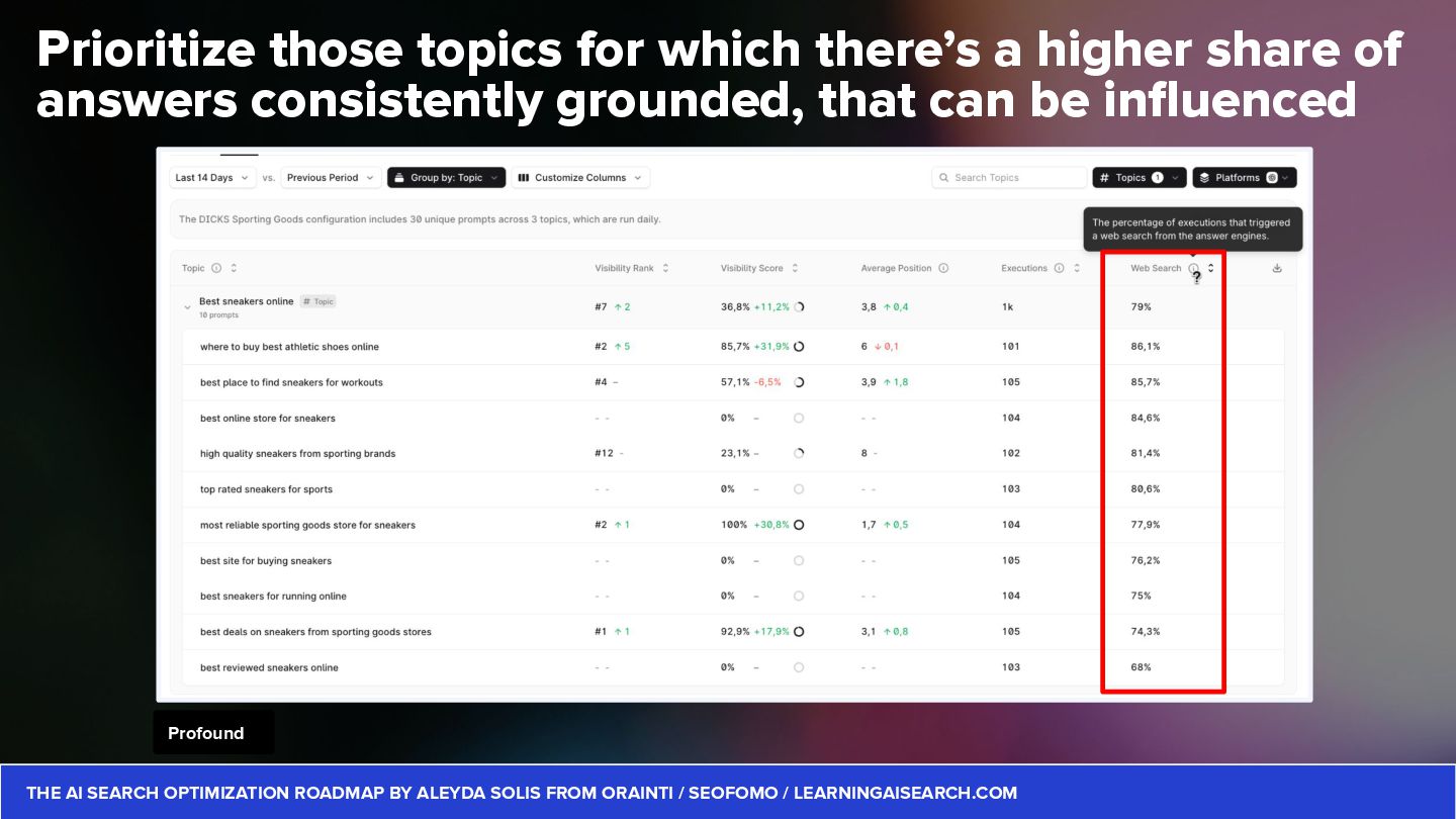 SEOFOMO / LEARNINGAISEARCH.COM Prioritize those topics for which there’s a higher share of answers consistently grounded, that can be influenced Profound THE AI SEARCH OPTIMIZATION ROADMAP BY ALEYDA SOLIS FROM ORAINTI / SEOFOMO / LEARNINGAISEARCH.COM