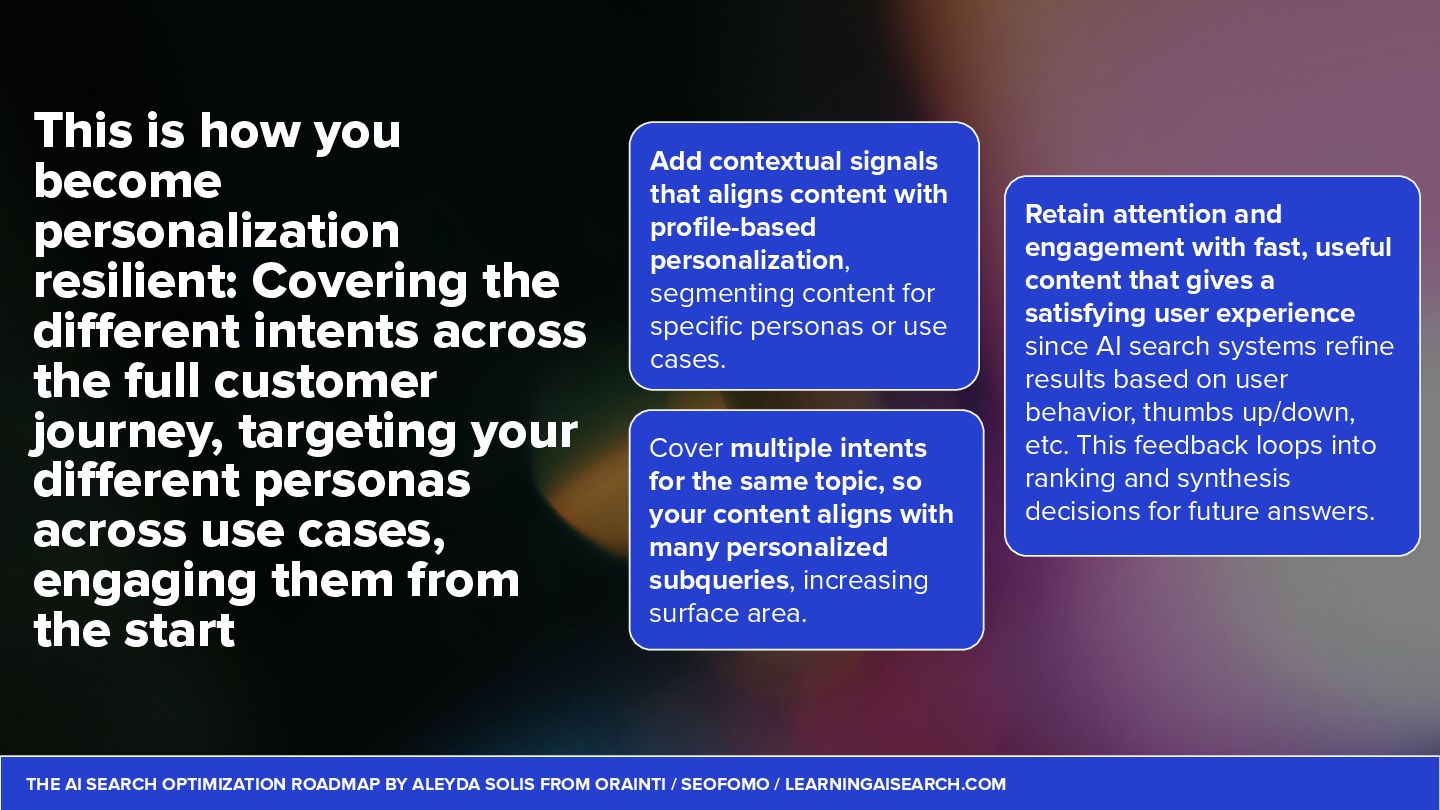 SEOFOMO / LEARNINGAISEARCH.COM THE AI SEARCH OPTIMIZATION ROADMAP BY ALEYDA SOLIS FROM ORAINTI / SEOFOMO / LEARNINGAISEARCH.COM Cover multiple intents for the same topic, so your content aligns with many personalized subqueries, increasing surface area. Add contextual signals that aligns content with profile-based personalization, segmenting content for specific personas or use cases. Retain attention and engagement with fast, useful content that gives a satisfying user experience since AI search systems refine results based on user behavior, thumbs up/down, etc. This feedback loops into ranking and synthesis decisions for future answers. This is how you become personalization resilient: Covering the different intents across the full customer journey, targeting your different personas across use cases, engaging them from the start