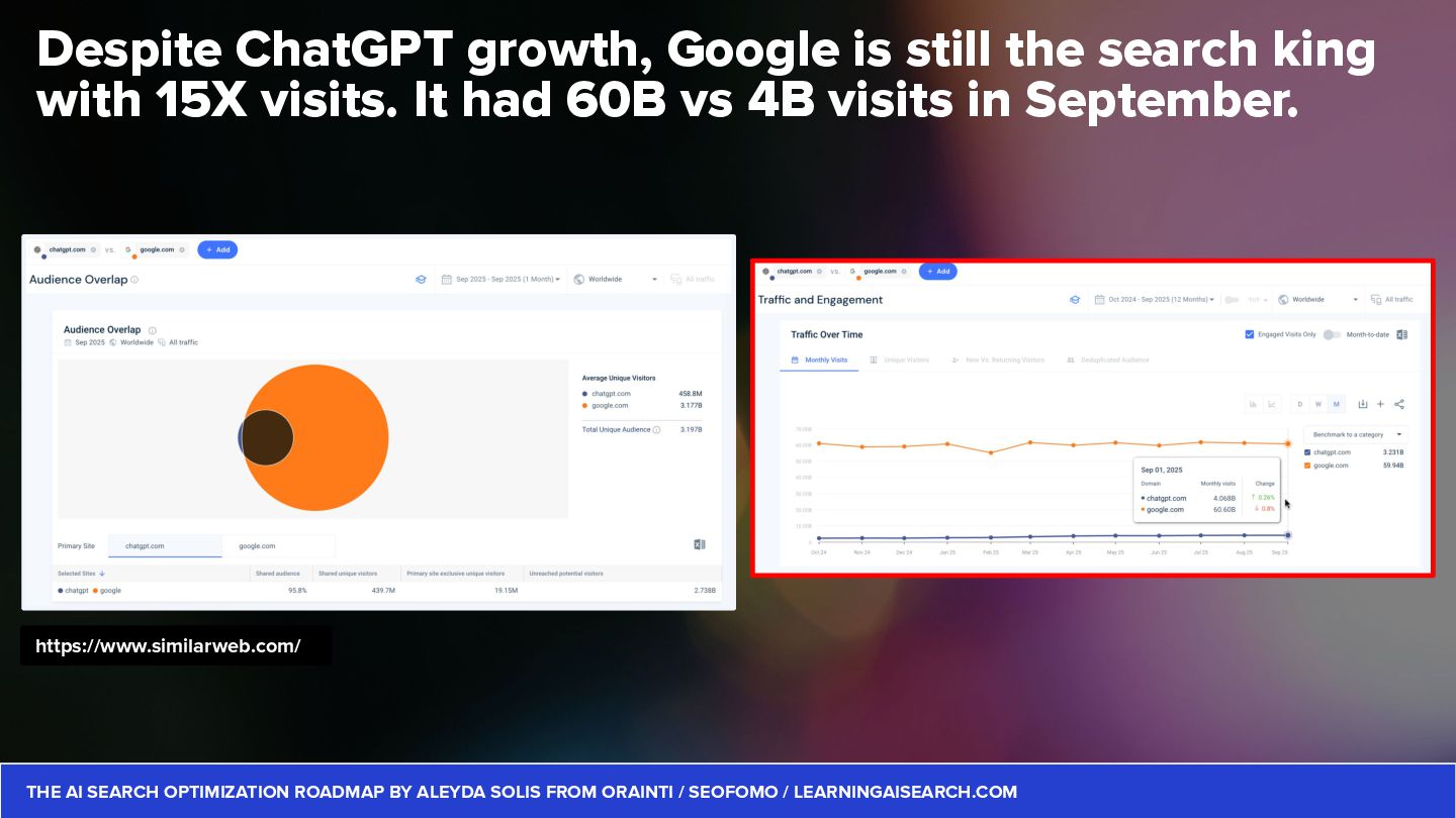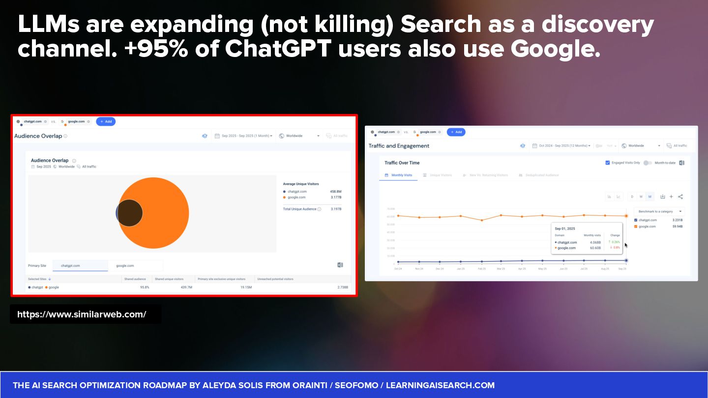 / SEOFOMO / LEARNINGAISEARCH.COM https://www.similarweb.com/ LLMs are expanding (not killing) Search as a discovery channel. +95% of ChatGPT users also use Google.