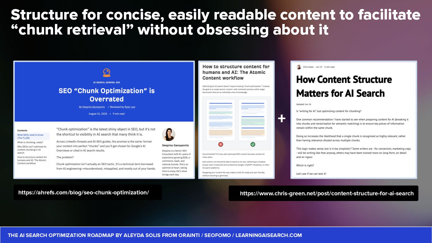 / SEOFOMO / LEARNINGAISEARCH.COM https://ahrefs.com/blog/seo-chunk-optimization/ https://www.chris-green.net/post/content-structure-for-ai-search Structure for concise, easily readable content to facilitate “chunk retrieval” without obsessing about it +