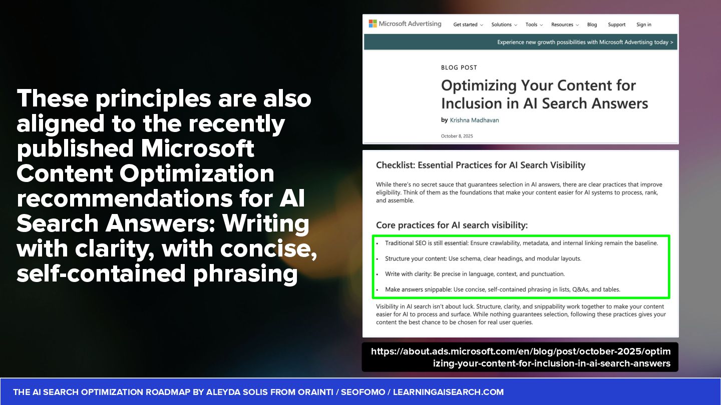 SEOFOMO / LEARNINGAISEARCH.COM THE AI SEARCH OPTIMIZATION ROADMAP BY ALEYDA SOLIS FROM ORAINTI / SEOFOMO / LEARNINGAISEARCH.COM https://about.ads.microsoft.com/en/blog/post/october-2025/optim izing-your-content-for-inclusion-in-ai-search-answers These principles are also aligned to the recently published Microsoft Content Optimization recommendations for AI Search Answers: Writing with clarity, with concise, self-contained phrasing