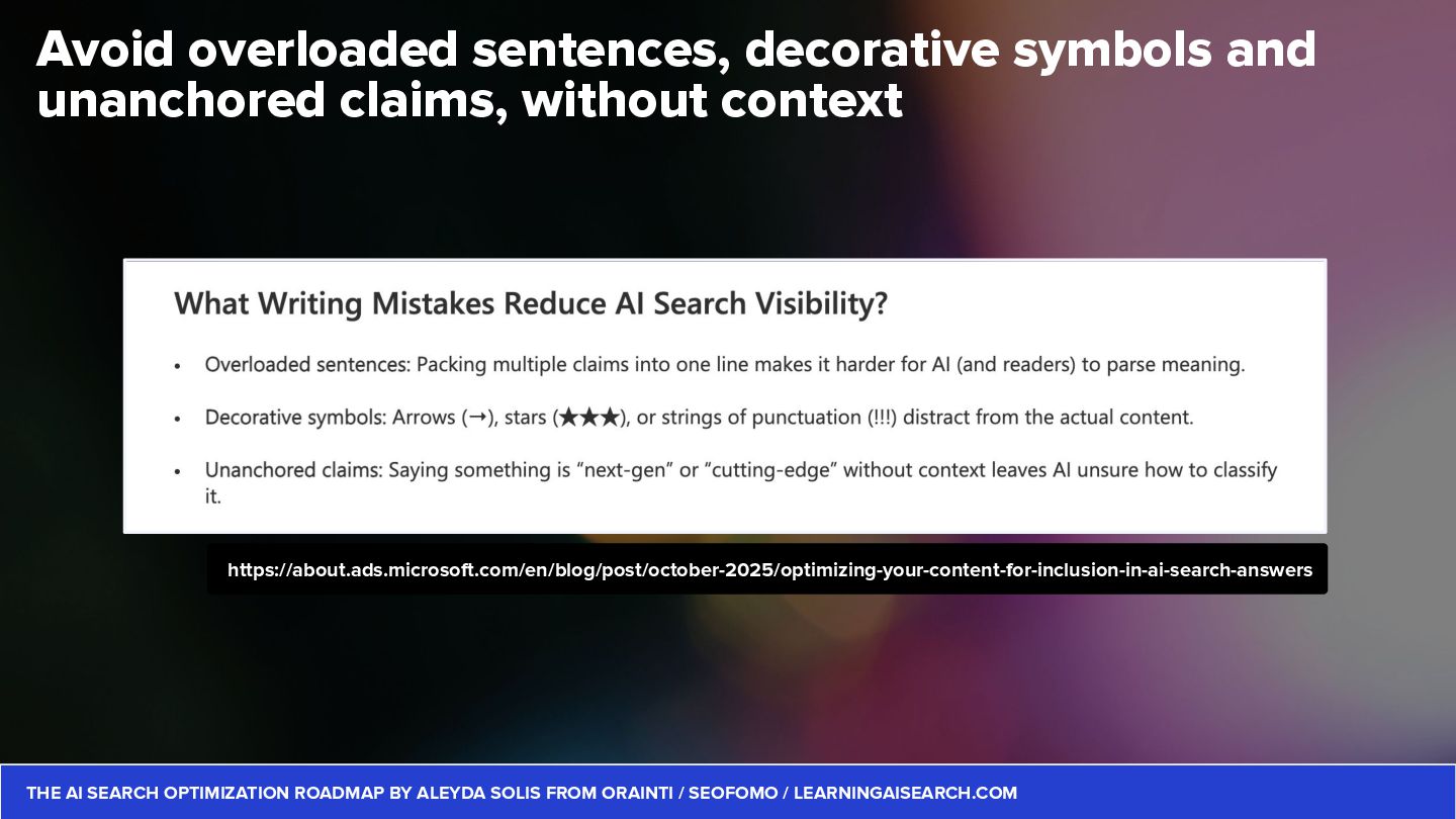 SEOFOMO / LEARNINGAISEARCH.COM THE AI SEARCH OPTIMIZATION ROADMAP BY ALEYDA SOLIS FROM ORAINTI / SEOFOMO / LEARNINGAISEARCH.COM https://about.ads.microsoft.com/en/blog/post/october-2025/optimizing-your-content-for-inclusion-in-ai-search-answers Avoid overloaded sentences, decorative symbols and unanchored claims, without context