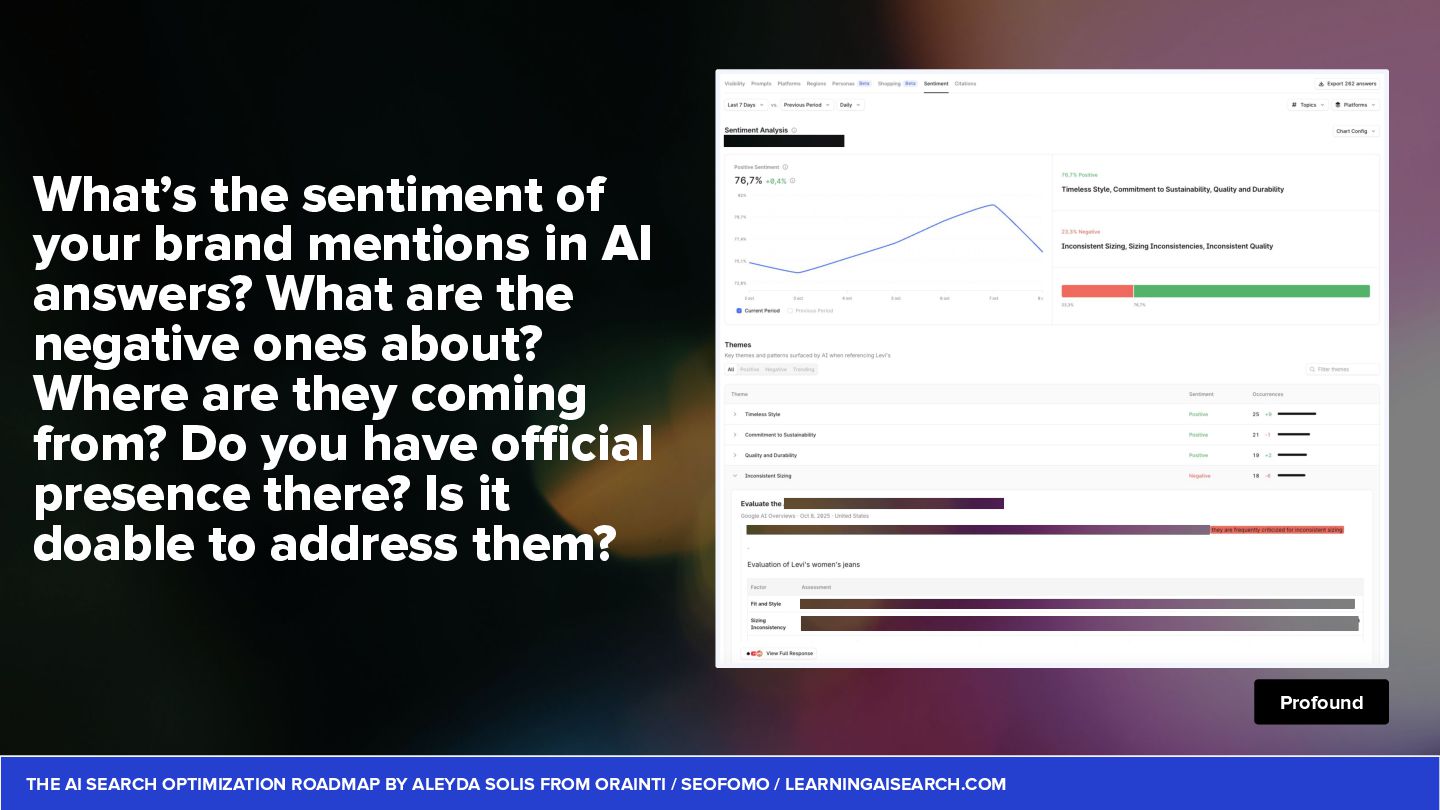 answers? What are the negative ones about? Where are they coming from? Do you have official presence there? Is it doable to address them? WINNING ECOMMERCE AI SEARCH BY ALEYDA SOLIS FROM ORAINTI / SEOFOMO / LEARNINGAISEARCH.COM THE AI SEARCH OPTIMIZATION ROADMAP BY ALEYDA SOLIS FROM ORAINTI / SEOFOMO / LEARNINGAISEARCH.COM