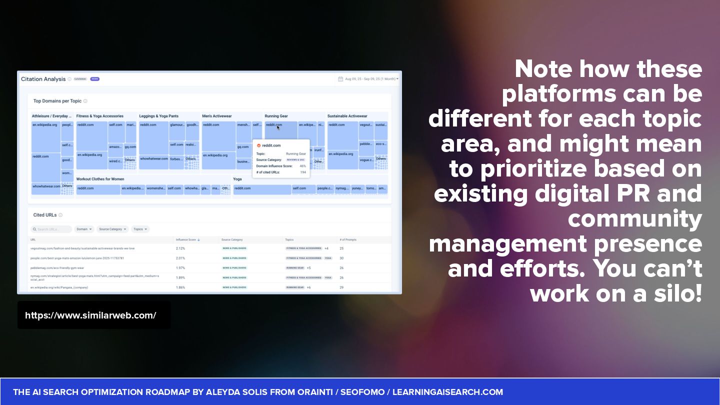 / SEOFOMO / LEARNINGAISEARCH.COM THE AI SEARCH OPTIMIZATION ROADMAP BY ALEYDA SOLIS FROM ORAINTI / SEOFOMO / LEARNINGAISEARCH.COM Note how these platforms can be different for each topic area, and might mean to prioritize based on existing digital PR and community management presence and efforts. You can’t work on a silo!