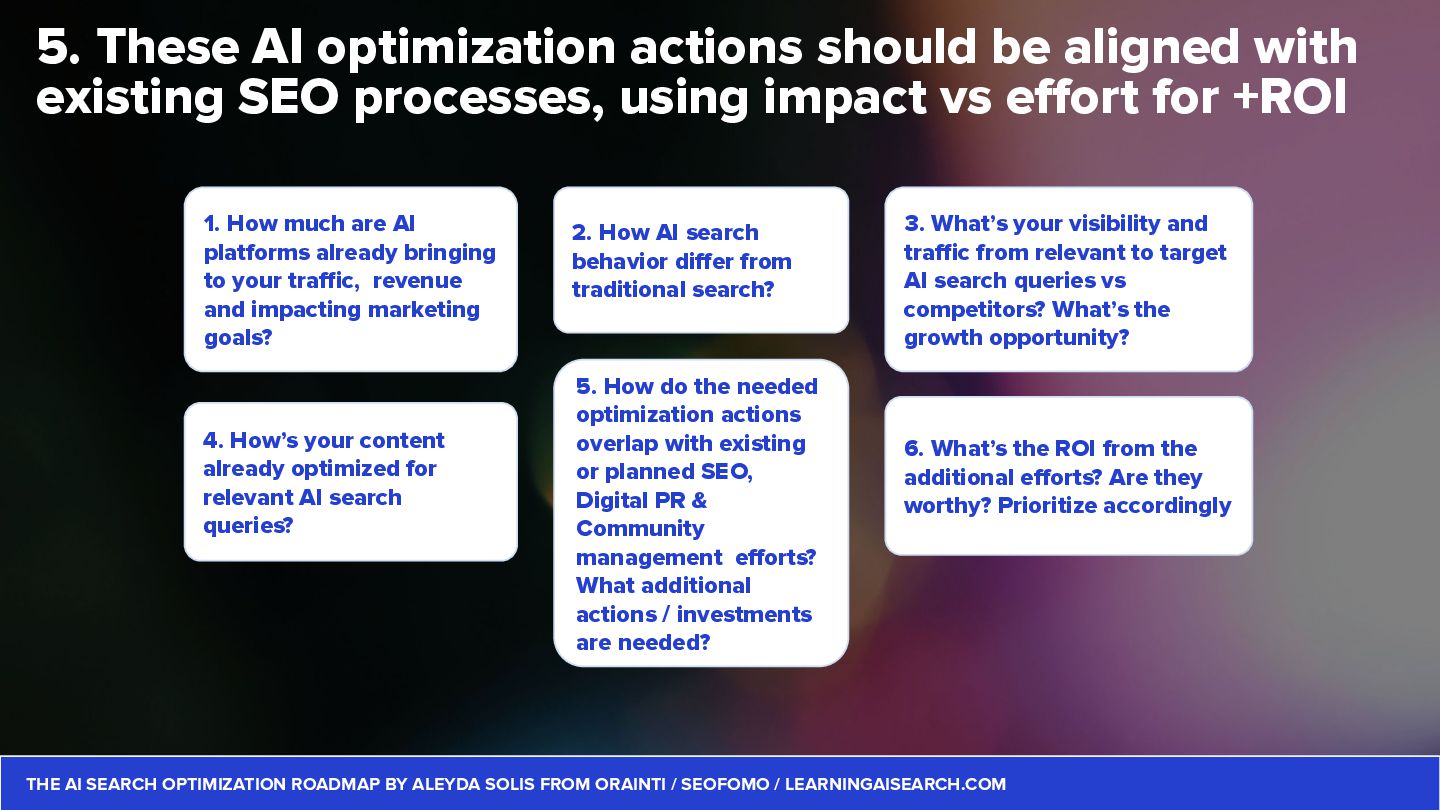 SEO processes, using impact vs effort for +ROI 1. How much are AI platforms already bringing to your traffic, revenue and impacting marketing goals? 2. How AI search behavior differ from traditional search? 3. What’s your visibility and traffic from relevant to target AI search queries vs competitors? What’s the growth opportunity? 4. How’s your content already optimized for relevant AI search queries? 5. How do the needed optimization actions overlap with existing or planned SEO, Digital PR & Community management efforts? What additional actions / investments are needed? 6. What’s the ROI from the additional efforts? Are they worthy? Prioritize accordingly WINNING ECOMMERCE AI SEARCH BY ALEYDA SOLIS FROM ORAINTI / SEOFOMO / LEARNINGAISEARCH.COM THE AI SEARCH OPTIMIZATION ROADMAP BY ALEYDA SOLIS FROM ORAINTI / SEOFOMO / LEARNINGAISEARCH.COM