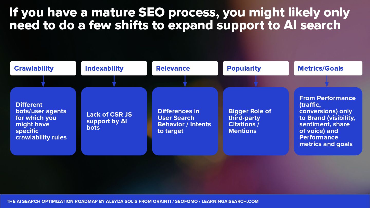 only need to do a few shifts to expand support to AI search Differences in User Search Behavior / Intents to target Bigger Role of third-party Citations / Mentions Different bots/user agents for which you might have specific crawlability rules Lack of CSR JS support by AI bots From Performance (traffic, conversions) only to Brand (visibility, sentiment, share of voice) and Performance metrics and goals Crawlability Indexability Relevance Popularity Metrics/Goals WINNING ECOMMERCE AI SEARCH BY ALEYDA SOLIS FROM ORAINTI / SEOFOMO / LEARNINGAISEARCH.COM THE AI SEARCH OPTIMIZATION ROADMAP BY ALEYDA SOLIS FROM ORAINTI / SEOFOMO / LEARNINGAISEARCH.COM