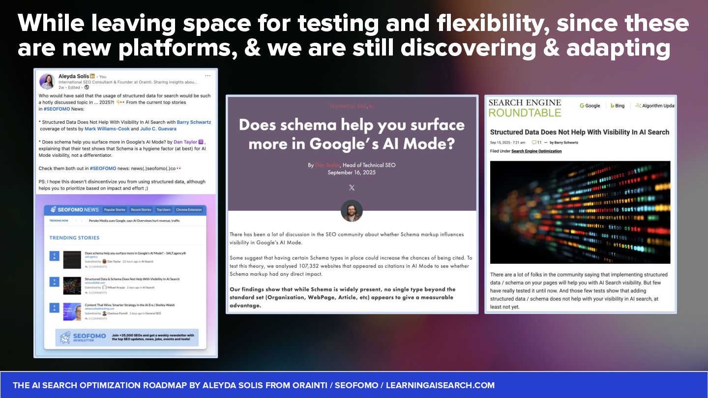 SEOFOMO / LEARNINGAISEARCH.COM THE AI SEARCH OPTIMIZATION ROADMAP BY ALEYDA SOLIS FROM ORAINTI / SEOFOMO / LEARNINGAISEARCH.COM Establish those consistent patterns in answer formats and sources aligned with those of your site vs AI Mode ChatGPT