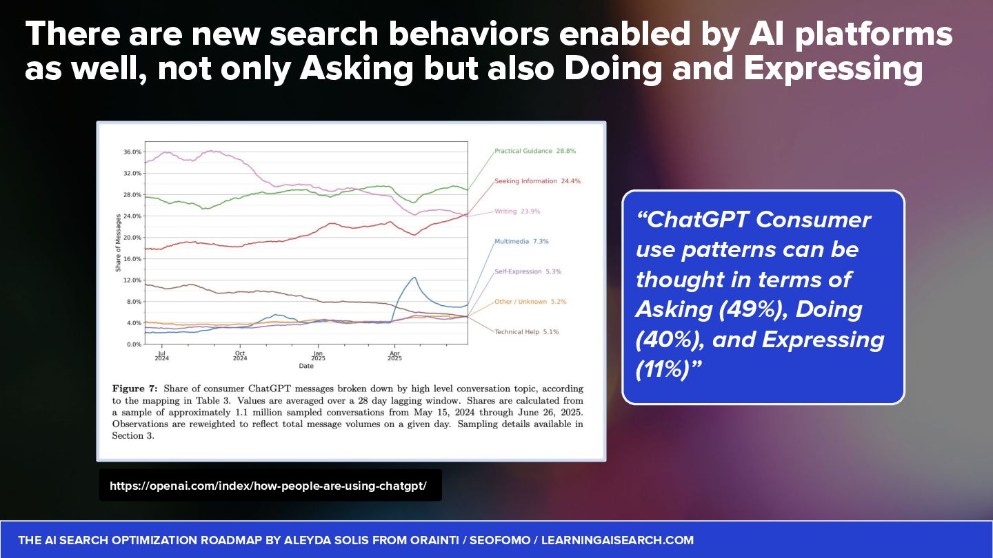 / SEOFOMO / LEARNINGAISEARCH.COM https://openai.com/index/how-people-are-using-chatgpt/ “ChatGPT Consumer use patterns can be thought in terms of Asking (49%), Doing (40%), and Expressing (11%)” There are new search behaviors enabled by AI platforms as well, not only Asking but also Doing and Expressing