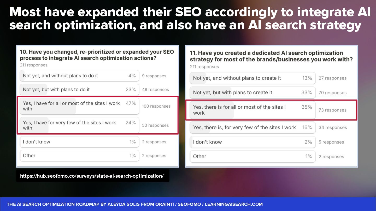 / SEOFOMO / LEARNINGAISEARCH.COM Most have expanded their SEO accordingly to integrate AI search optimization, and also have an AI search strategy https://hub.seofomo.co/surveys/state-ai-search-optimization/