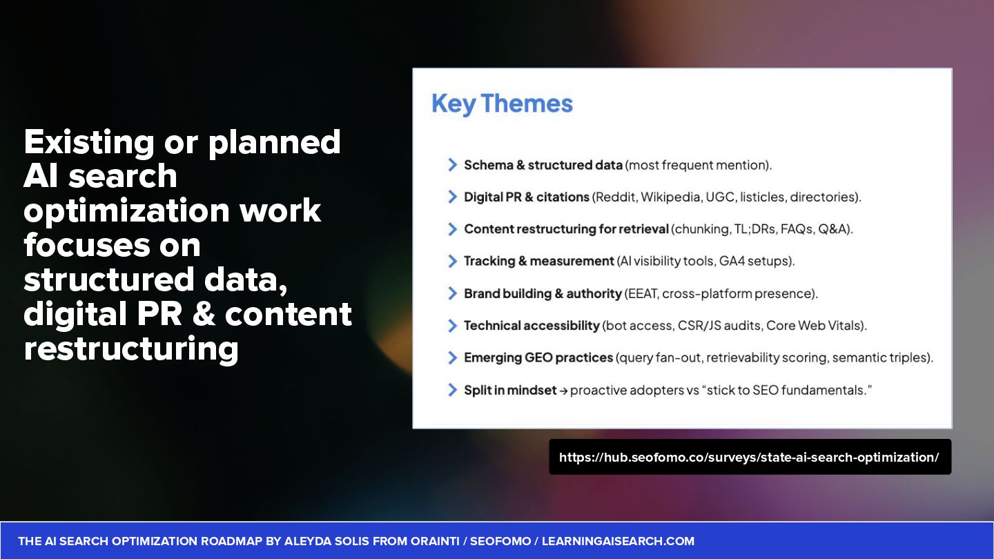 / SEOFOMO / LEARNINGAISEARCH.COM https://hub.seofomo.co/surveys/state-ai-search-optimization/ Existing or planned AI search optimization work focuses on structured data, digital PR & content restructuring