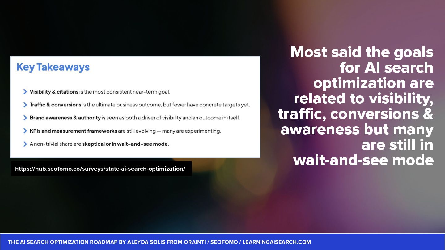 / SEOFOMO / LEARNINGAISEARCH.COM Most said the goals for AI search optimization are related to visibility, traffic, conversions & awareness but many are still in wait-and-see mode https://hub.seofomo.co/surveys/state-ai-search-optimization/