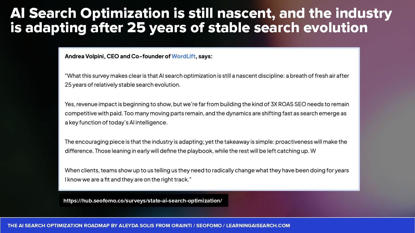 / SEOFOMO / LEARNINGAISEARCH.COM https://hub.seofomo.co/surveys/state-ai-search-optimization/ AI Search Optimization is still nascent, and the industry is adapting after 25 years of stable search evolution