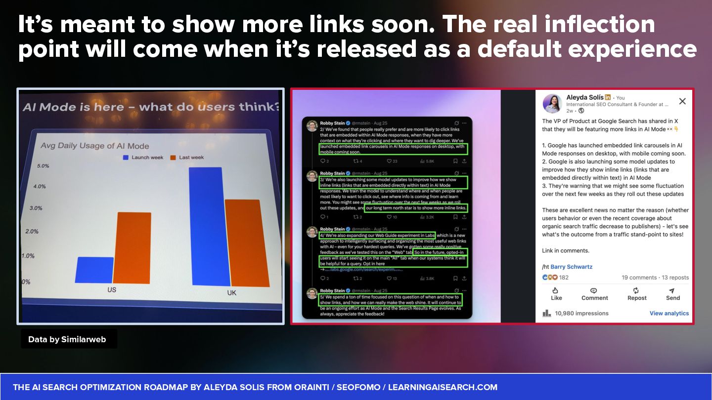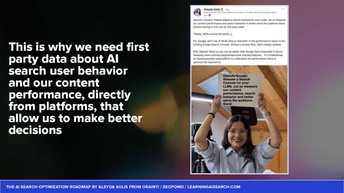 SEOFOMO / LEARNINGAISEARCH.COM THE AI SEARCH OPTIMIZATION ROADMAP BY ALEYDA SOLIS FROM ORAINTI / SEOFOMO / LEARNINGAISEARCH.COM This is why we need first party data about AI search user behavior and our content performance, directly from platforms, that allow us to make better decisions