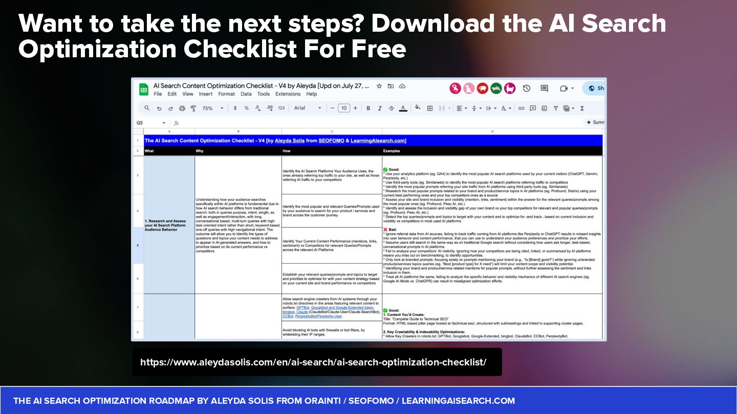 Optimization Checklist For Free https://www.aleydasolis.com/en/ai-search/ai-search-optimization-checklist/ WINNING ECOMMERCE AI SEARCH BY ALEYDA SOLIS FROM ORAINTI / SEOFOMO / LEARNINGAISEARCH.COM THE AI SEARCH OPTIMIZATION ROADMAP BY ALEYDA SOLIS FROM ORAINTI / SEOFOMO / LEARNINGAISEARCH.COM