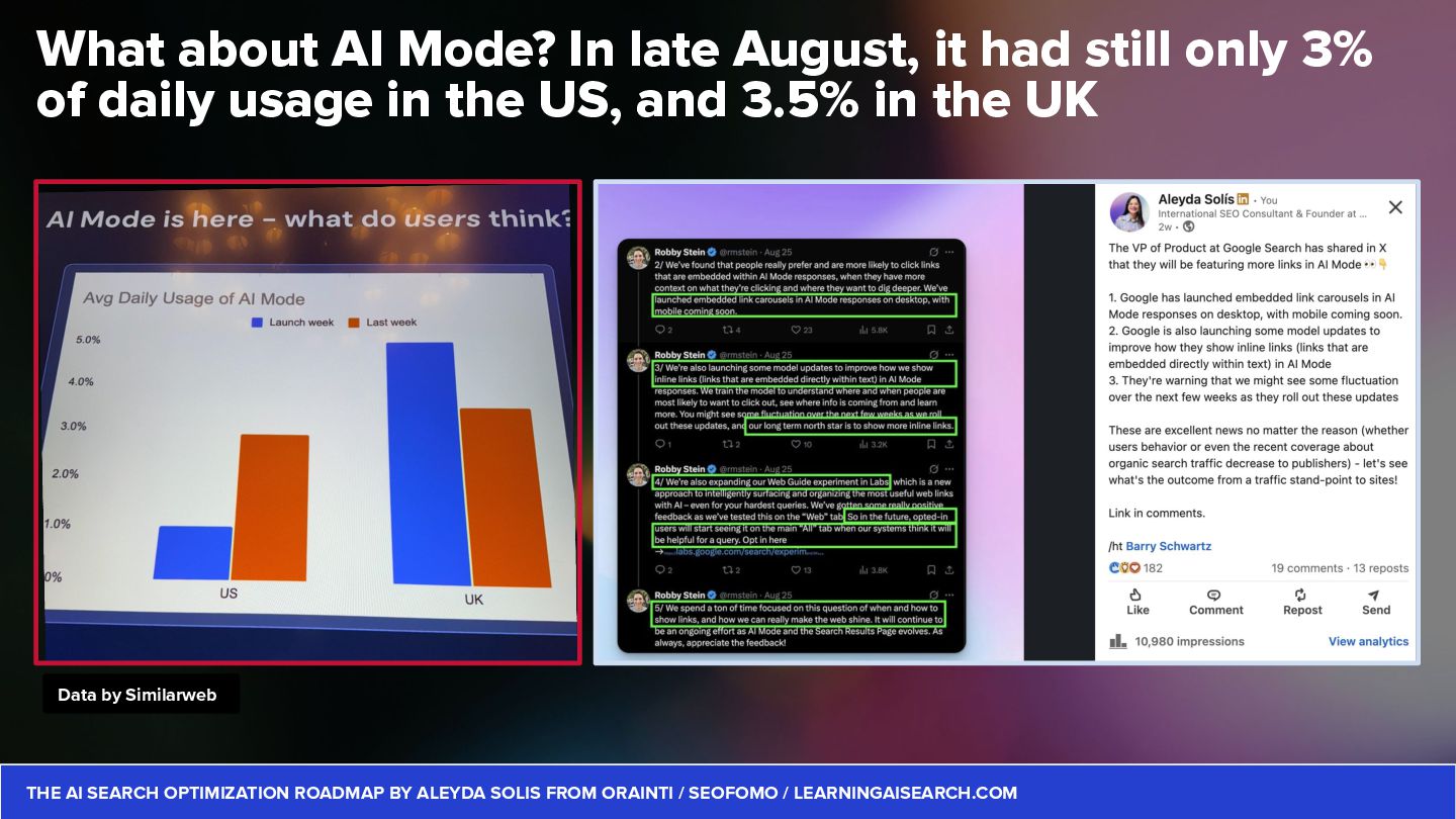 only 3% of daily usage in the US, and 3.5% in the UK THE AI SEARCH OPTIMIZATION ROADMAP BY ALEYDA SOLIS FROM ORAINTI / SEOFOMO / LEARNINGAISEARCH.COM Data by Similarweb