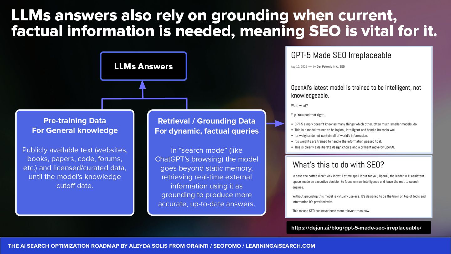 is needed, meaning SEO is vital for it. THE AI SEARCH OPTIMIZATION ROADMAP BY ALEYDA SOLIS FROM ORAINTI / SEOFOMO / LEARNINGAISEARCH.COM https://dejan.ai/blog/gpt-5-made-seo-irreplaceable/ LLMs Answers Retrieval / Grounding Data For dynamic, factual queries In “search mode” (like ChatGPT’s browsing) the model goes beyond static memory, retrieving real-time external information using it as grounding to produce more accurate, up-to-date answers. Pre-training Data For General knowledge Publicly available text (websites, books, papers, code, forums, etc.) and licensed/curated data, until the model’s knowledge cutoff date.