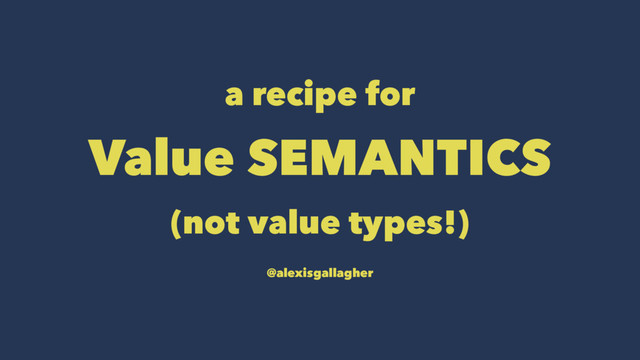 A type Foo has value semantics if the Valucist always wins: var v:Foo = Foo() // Valucist chooses Foo to defend v var s = v let v0 = valueOf(v) /* { SideEffector attacks v using only s } */ let v1 = valueOf(v) assert(v0 == v1) // v unchanged? Valucist wins!