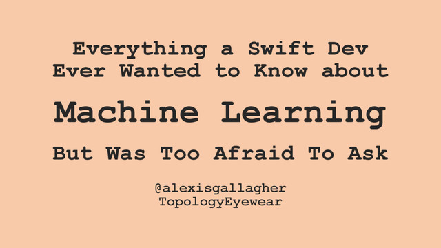 data. Accuracy and loss function. Overfit vs underfit. Models. Linear and logistic regression. Convolutional, recurrent, and adversarial neural networks. Support vector machines. Ensemble regression trees. Etc. Libraries. TensorFlow. Theano. Caffe. Torch. Keras. SciPy. NumPy. HelloWorlds. MNIST. ImageNet. Iris images. Networks. Inception. AlexNet. VGGNet. Resources. Intro to ML, Andrew Ng (Coursera). Siraj Ravel (Youtube). TensorFlow Summit videos. This Week in Machine Learning.