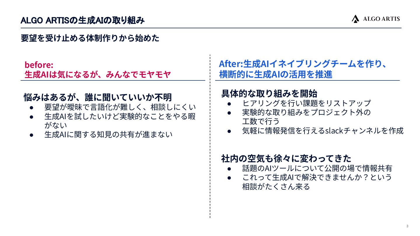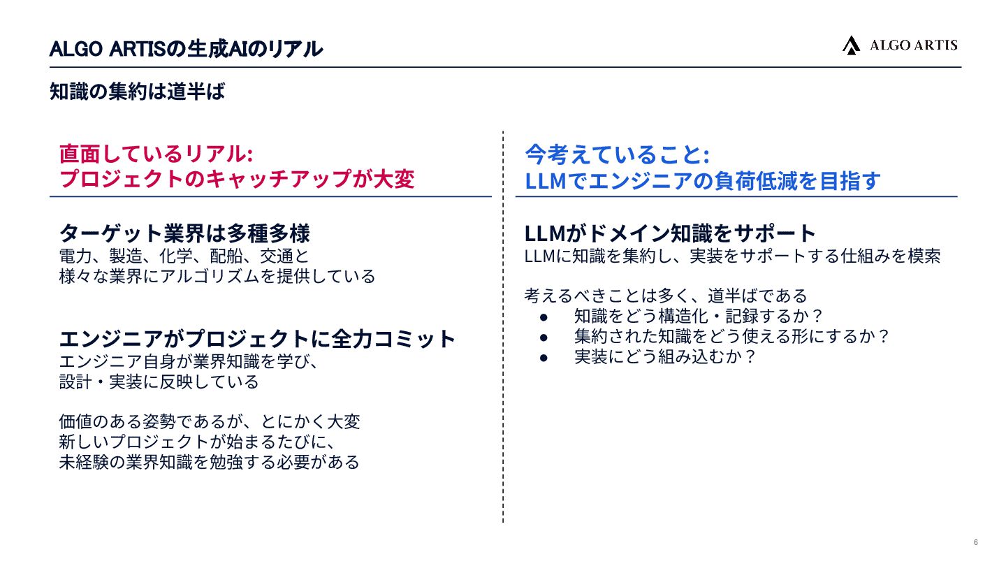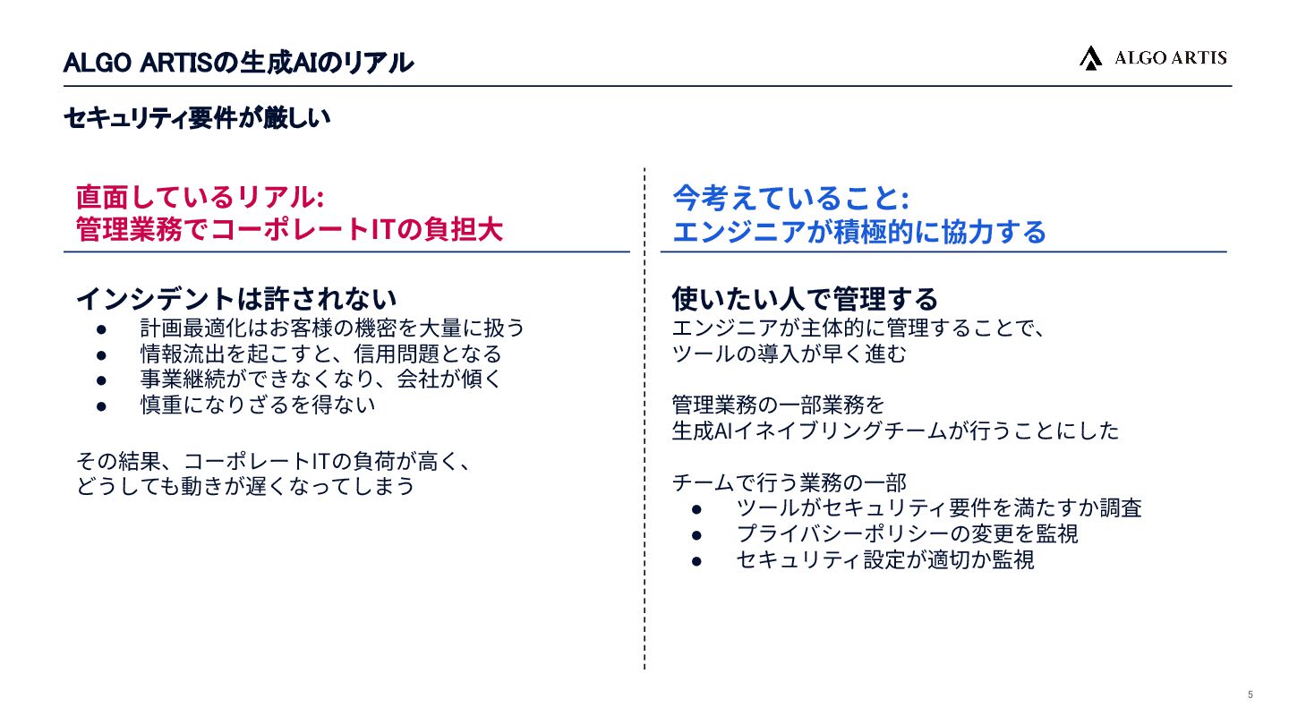管理業務でコーポレートITの負担⼤ インシデントは許されない • 計画最適化はお客様の機密を⼤量に扱う • 情報流出を起こすと、信⽤問題となる • 事業継続ができなくなり、会社が傾く • 慎重になりざるを得ない その結果、コーポレートITの負荷が⾼く、 どうしても動きが遅くなってしまう 使いたい⼈で管理する エンジニアが主体的に管理することで、 ツールの導⼊が早く進む 管理業務の⼀部業務を ⽣成AIイネイブリングチームが⾏うことにした チームで⾏う業務の⼀部 • ツールがセキュリティ要件を満たすか調査 • プライバシーポリシーの変更を監視 • セキュリティ設定が適切か監視