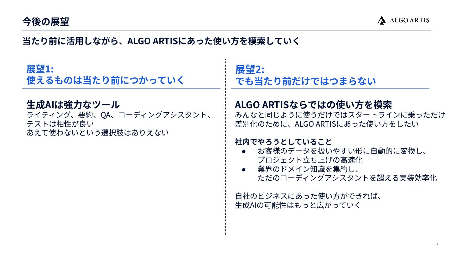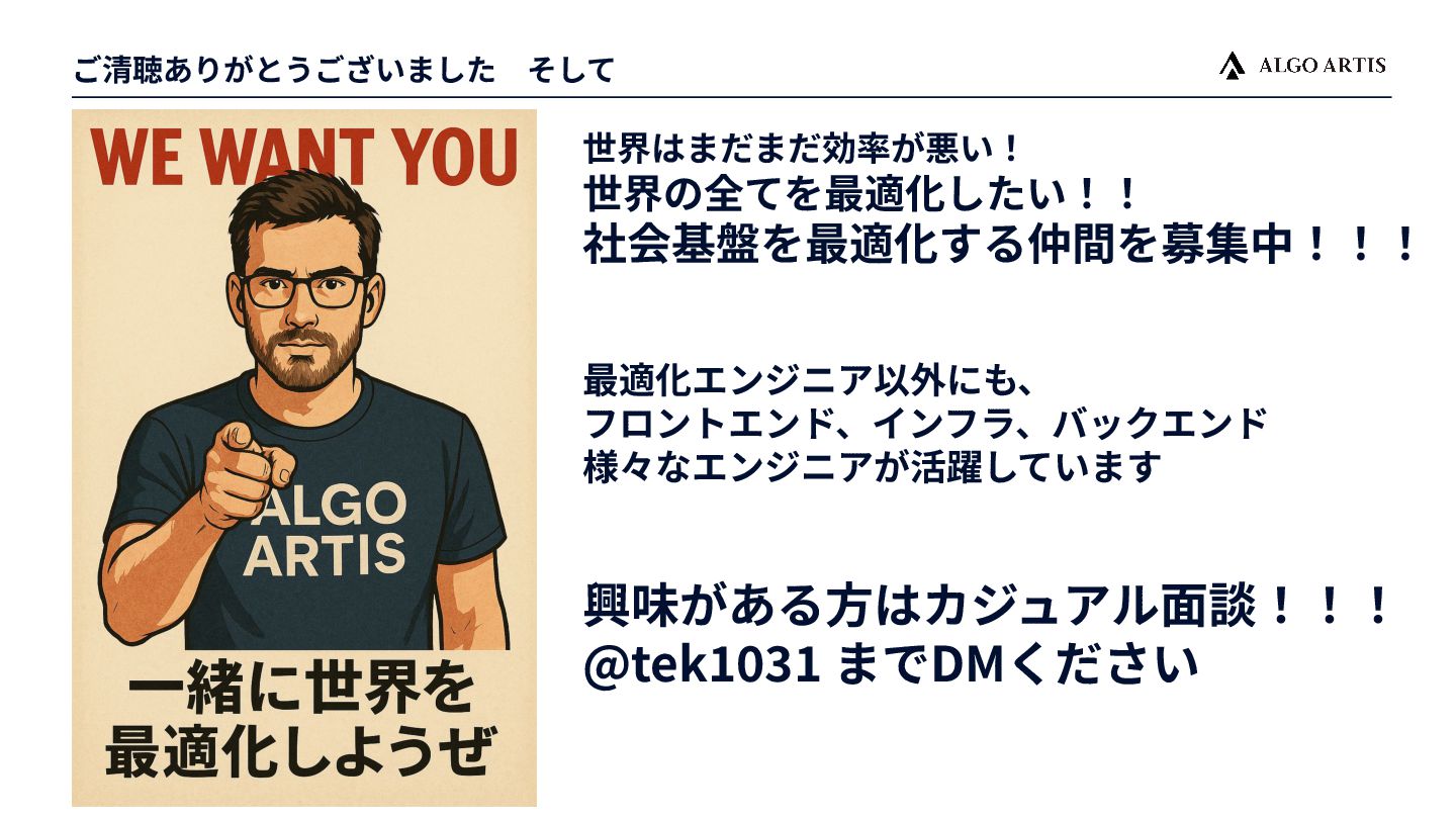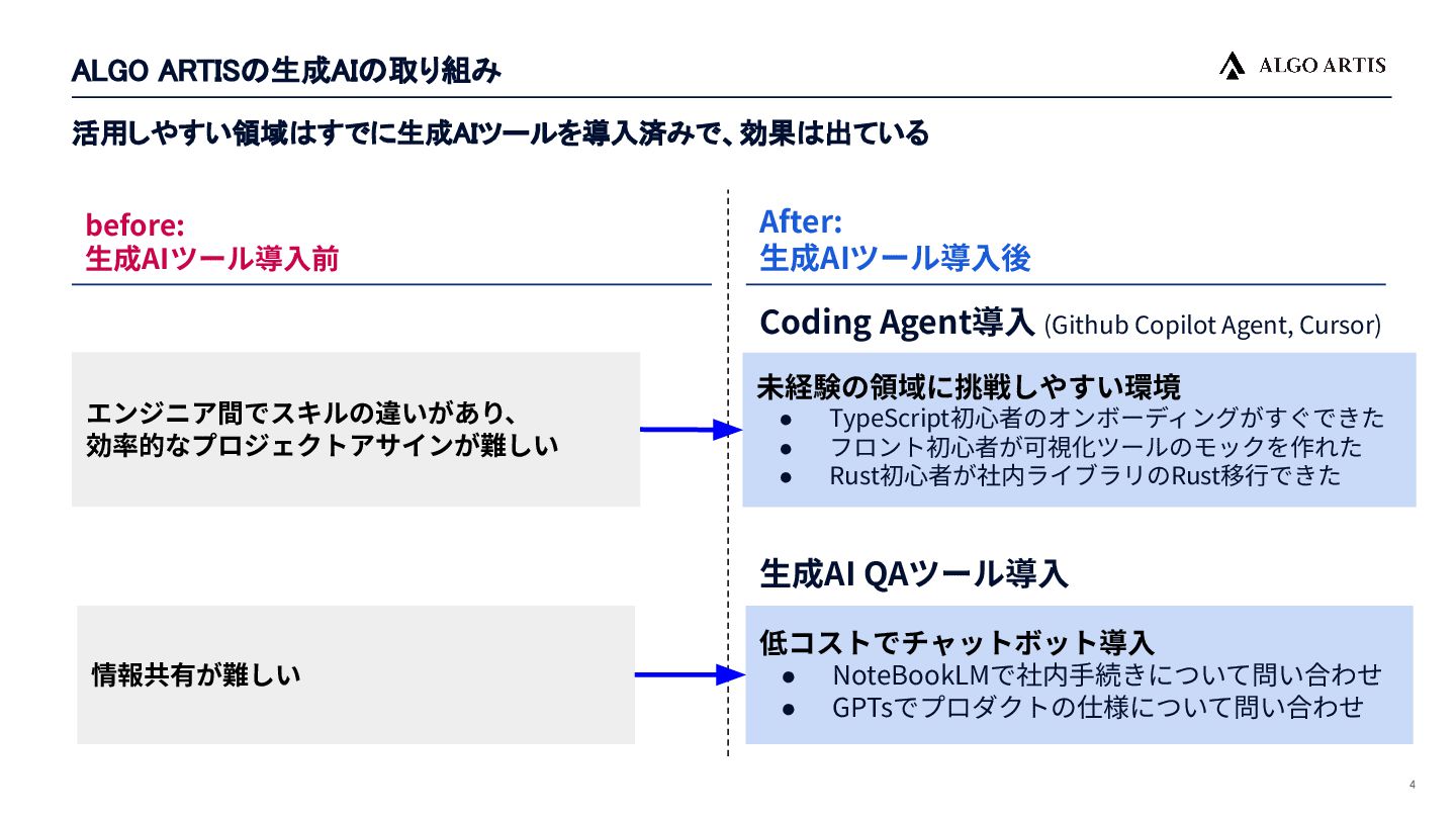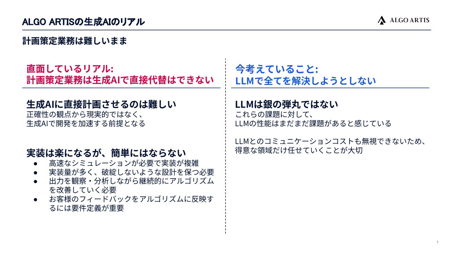 管理業務でコーポレートITの負担⼤ インシデントは許されない • 計画最適化はお客様の機密を⼤量に扱う • 情報流出を起こすと、信⽤問題となる • 事業継続ができなくなり、会社が傾く • 慎重になりざるを得ない その結果、コーポレートITの負荷が⾼く、 どうしても動きが遅くなってしまう 使いたい⼈で管理する エンジニアが主体的に管理することで、 ツールの導⼊が早く進む 管理業務の⼀部業務を ⽣成AIイネイブリングチームが⾏うことにした チームで⾏う業務の⼀部 • ツールがセキュリティ要件を満たすか調査 • プライバシーポリシーの変更を監視 • セキュリティ設定が適切か監視