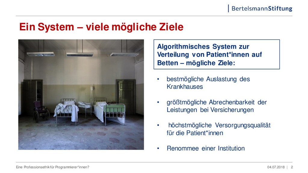 Ziele: • bestmögliche Auslastung des Krankhauses • größtmögliche Abrechenbarkeit der Leistungen bei Versicherungen • höchstmögliche Versorgungsqualität für die Patient*innen • Renommee einer Institution 04.07.2018 | Eine Professionsethik für Programmierer*innen? 2 Ein System – viele mögliche Ziele