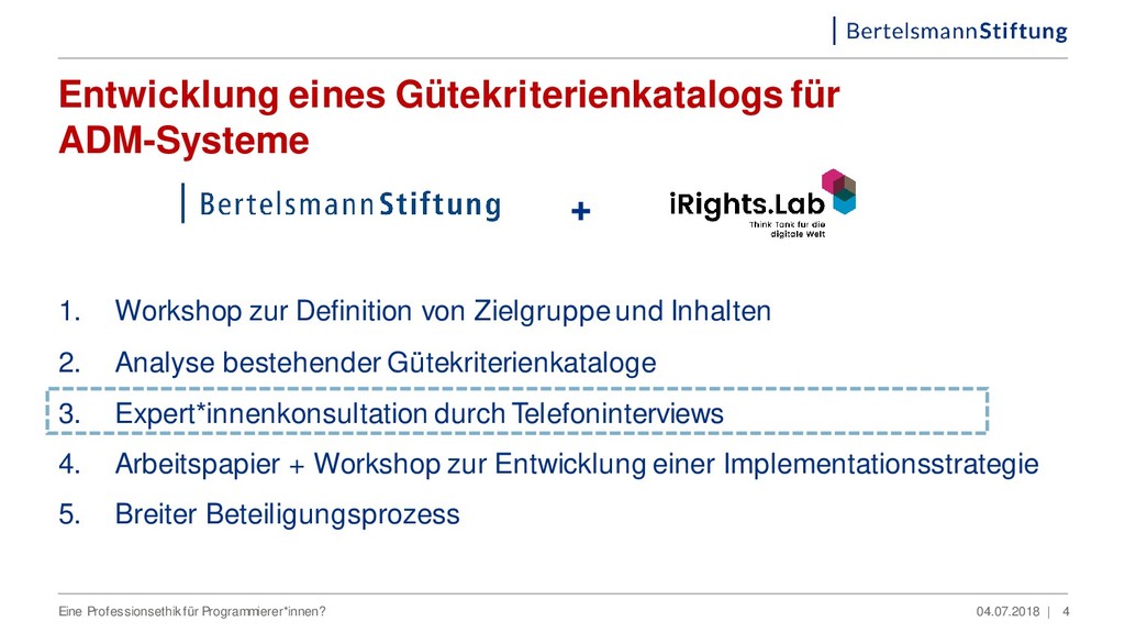 Professionsethik für Programmierer*innen? 1. Workshop zur Definition von Zielgruppe und Inhalten 2. Analyse bestehender Gütekriterienkataloge 3. Expert*innenkonsultation durch Telefoninterviews 4. Arbeitspapier + Workshop zur Entwicklung einer Implementationsstrategie 5. Breiter Beteiligungsprozess