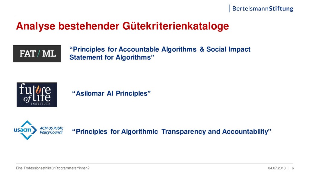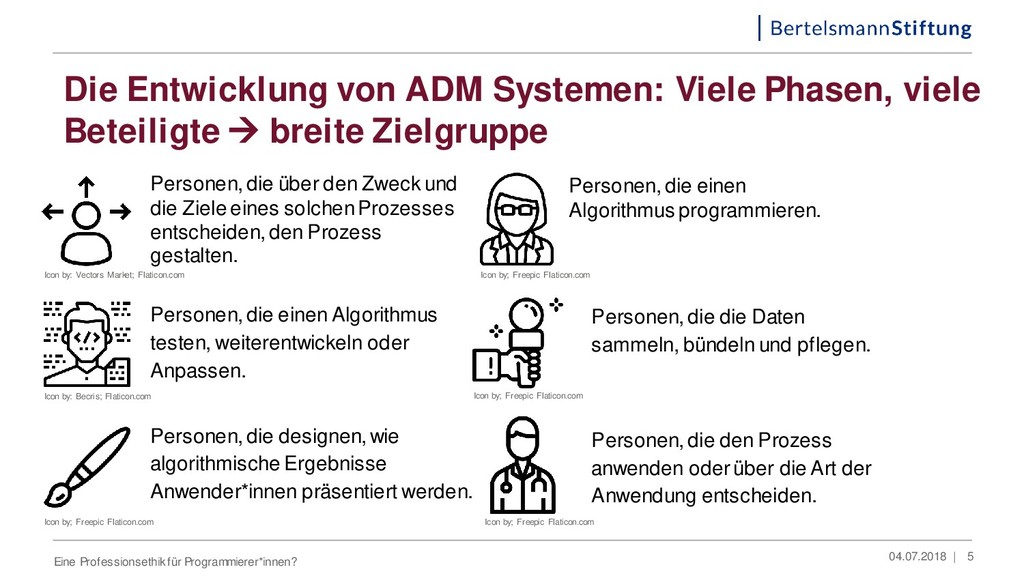 breite Zielgruppe 5 Eine Professionsethik für Programmierer*innen? Personen, die über den Zweck und die Ziele eines solchen Prozesses entscheiden, den Prozess gestalten. Personen, die einen Algorithmus testen, weiterentwickeln oder Anpassen. Personen, die den Prozess anwenden oder über die Art der Anwendung entscheiden. Personen, die einen Algorithmus programmieren. Personen, die die Daten sammeln, bündeln und pflegen. Personen, die designen, wie algorithmische Ergebnisse Anwender*innen präsentiert werden. 04.07.2018 | Icon by: Vectors Market; Flaticon.com Icon by: Becris; Flaticon.com Icon by; Freepic Flaticon.com Icon by; Freepic Flaticon.com Icon by; Freepic Flaticon.com Icon by; Freepic Flaticon.com