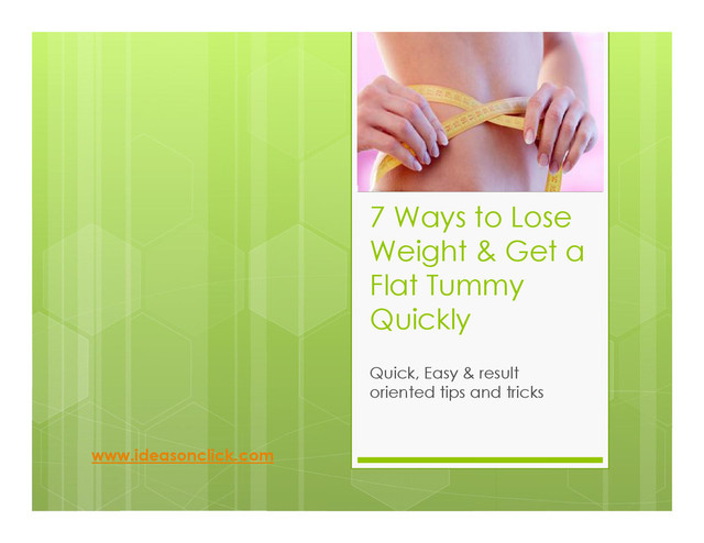 Slide contains some nice ideas, tips and tricks to loose weight quickly and have a flat belly. All tips and tricks and practiced and we hope if any one would follow these for sure individual will get the results very quickly.