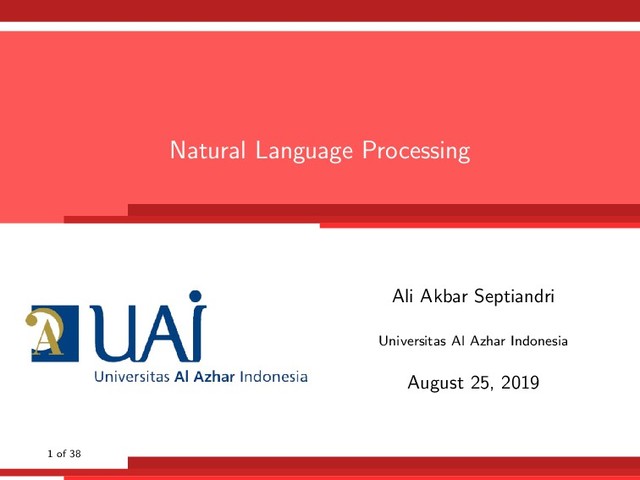 interaksi manusia dan komputer melalui bahasa alami manusia. Beberapa hal yang dibahas di dalamnya antara lain: • Part-of-Speech (POS) tagging • Parsing • Stemming • Machine translation • Named entity recognition (NER) • Question answering • Sentiment analysis • Automatic summarisation • Speech recognition • Text-to-speech 3 of 38