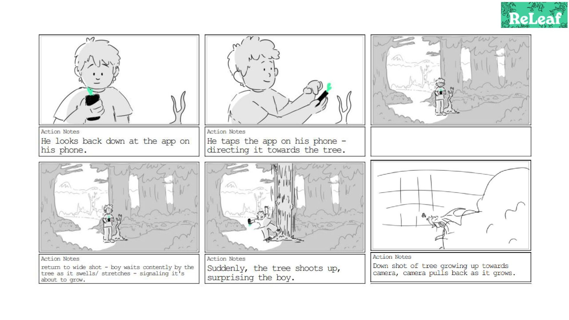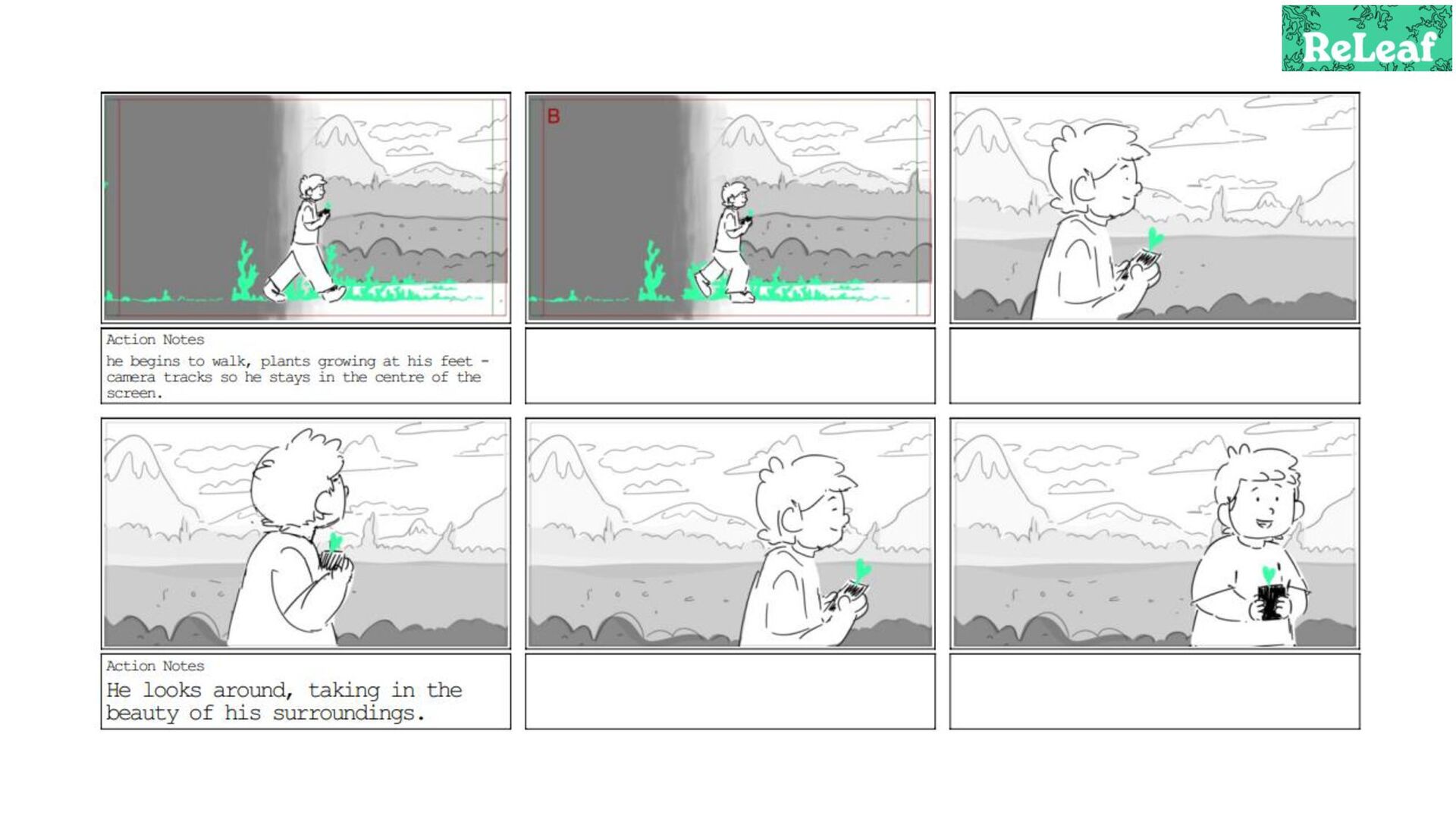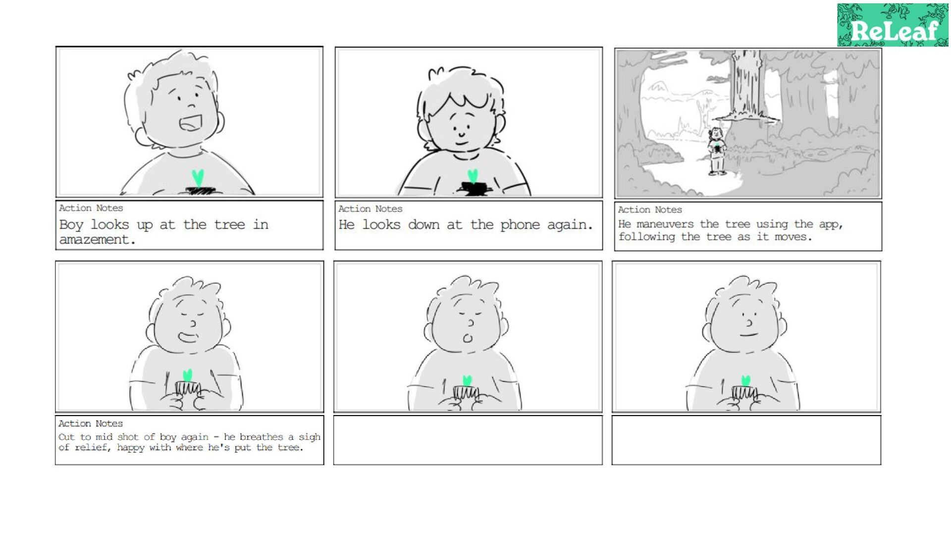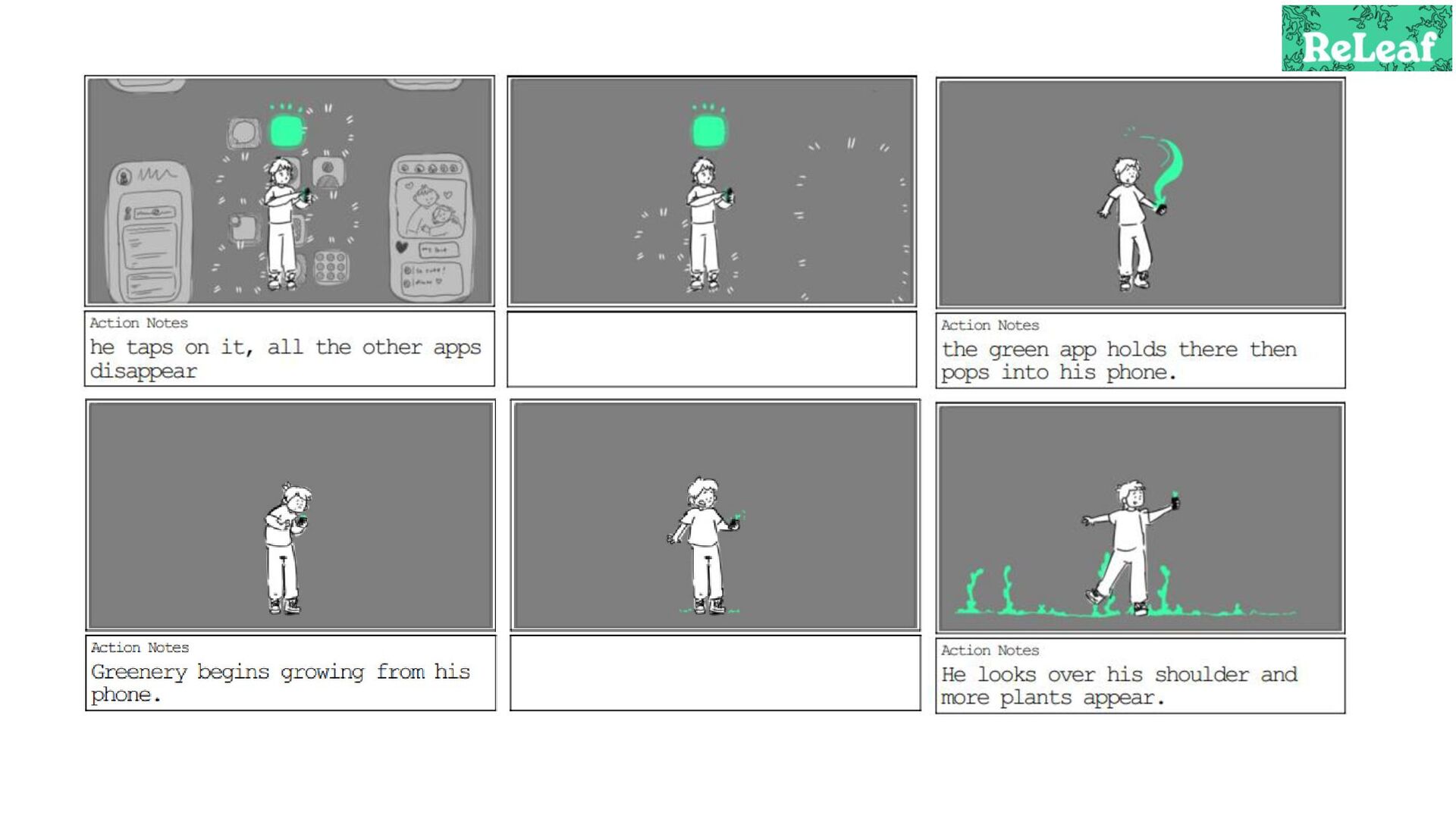 Storyboard for an animated commercial for the app 'ReLeaf'