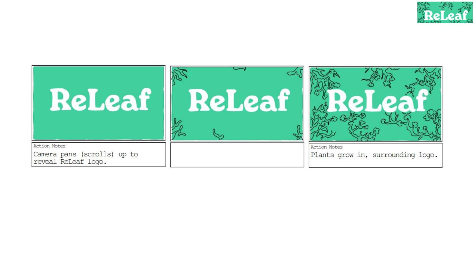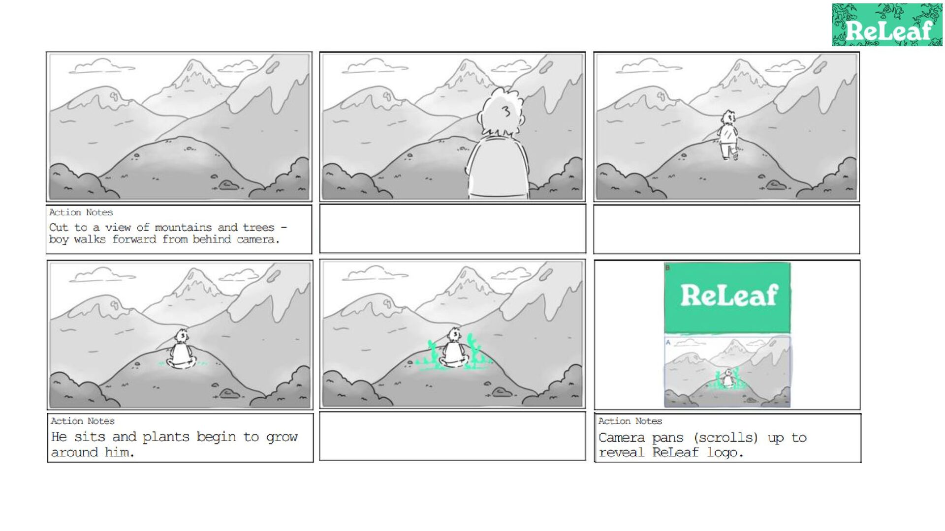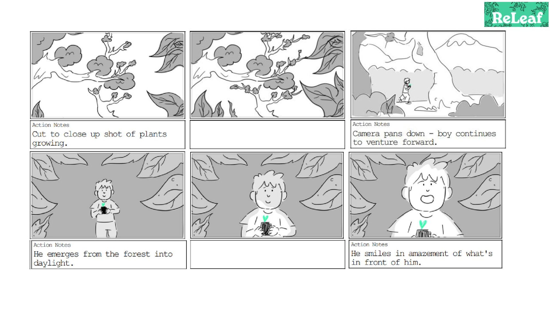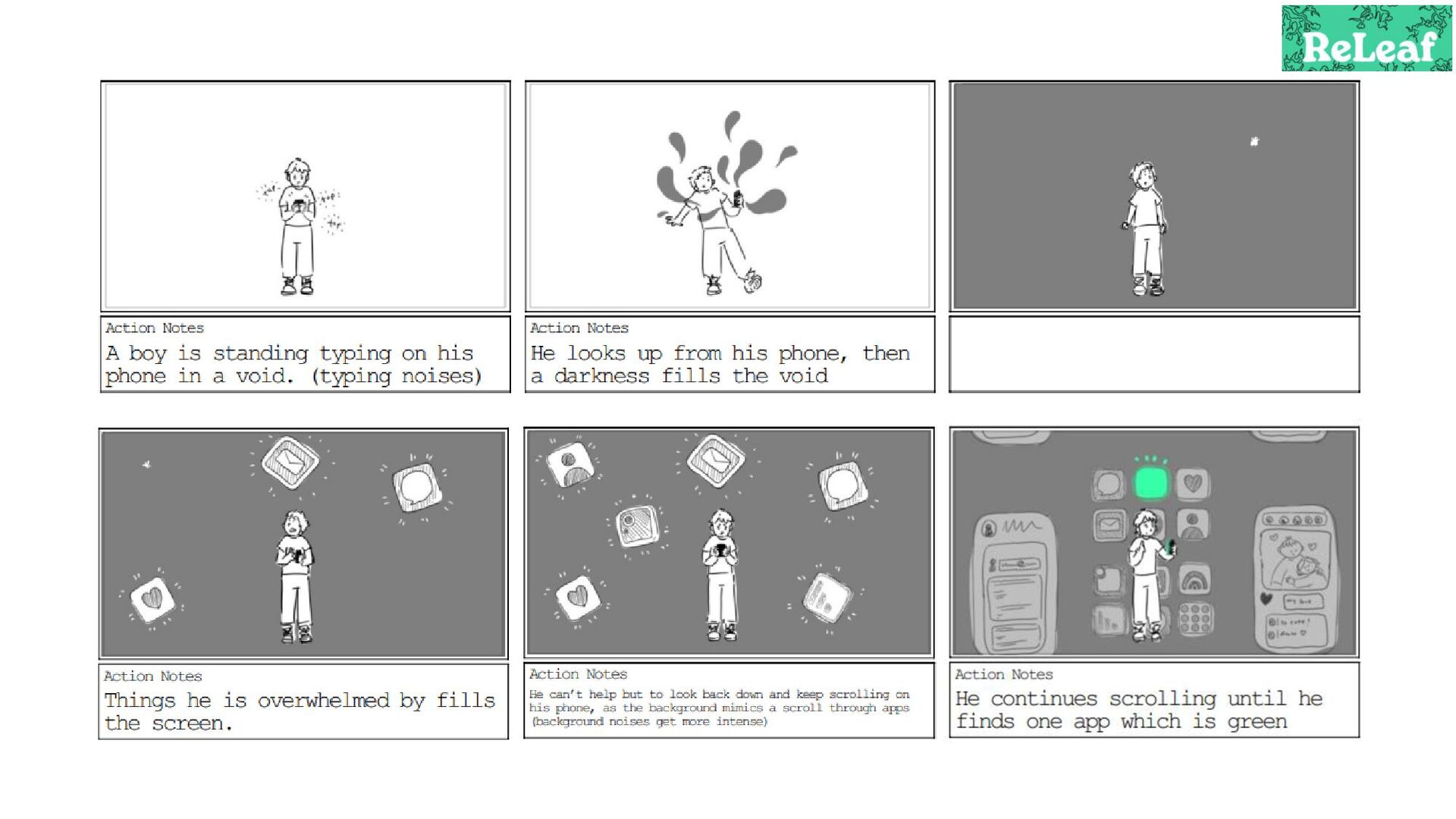 Storyboard for an animated commercial for the app 'ReLeaf'