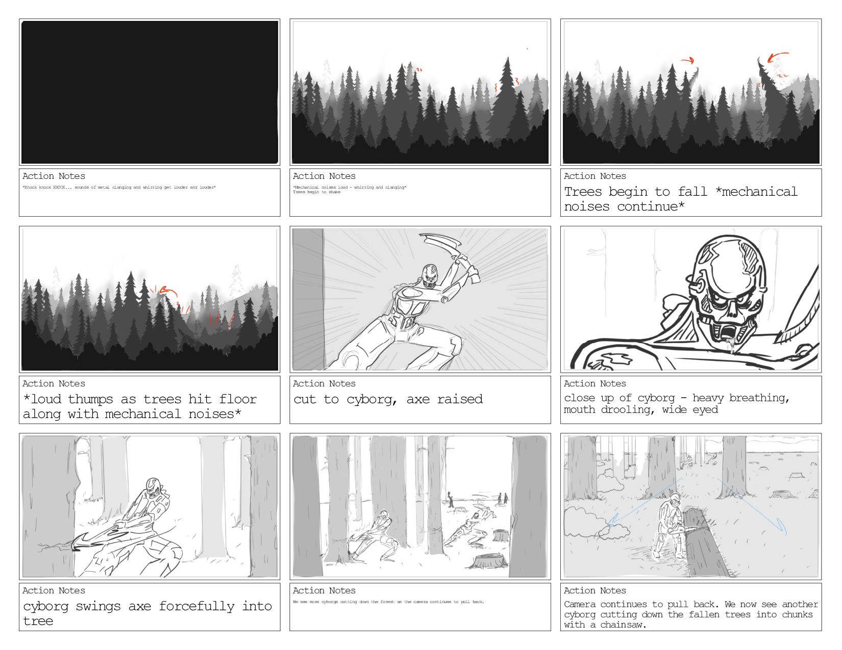 whirring get louder and louder* Action Notes *Mechanical noises loud - whirring and clanging* Trees begin to shake Action Notes Trees begin to fall *mechanical noises continue* Action Notes *loud thumps as trees hit floor along with mechanical noises* Action Notes cut to cyborg, axe raised Action Notes close up of cyborg - heavy breathing, mouth drooling, wide eyed Action Notes cyborg swings axe forcefully into tree Action Notes We see more cyborgs cutting down the forest as the camera continues to pull back. Action Notes Camera continues to pull back. We now see another cyborg cutting down the fallen trees into chunks with a chainsaw.